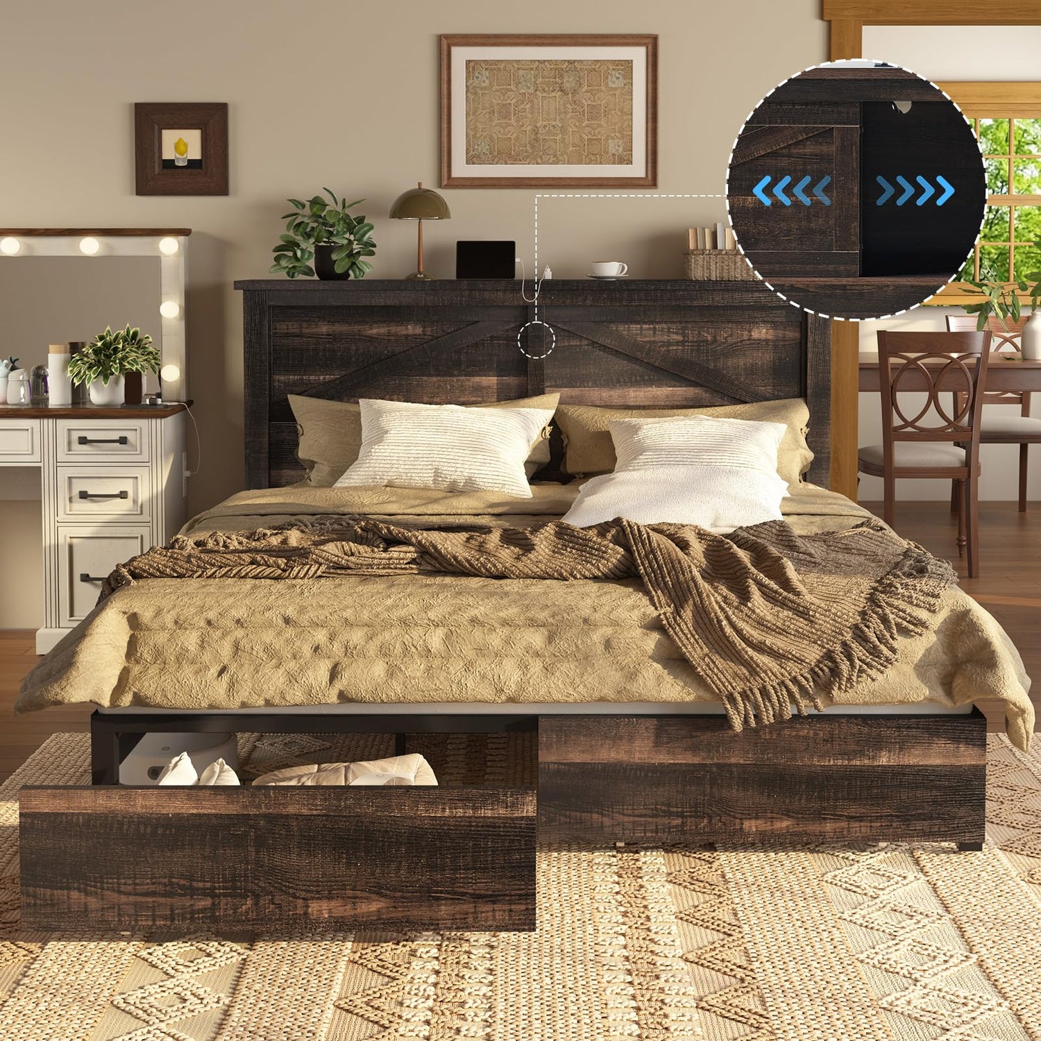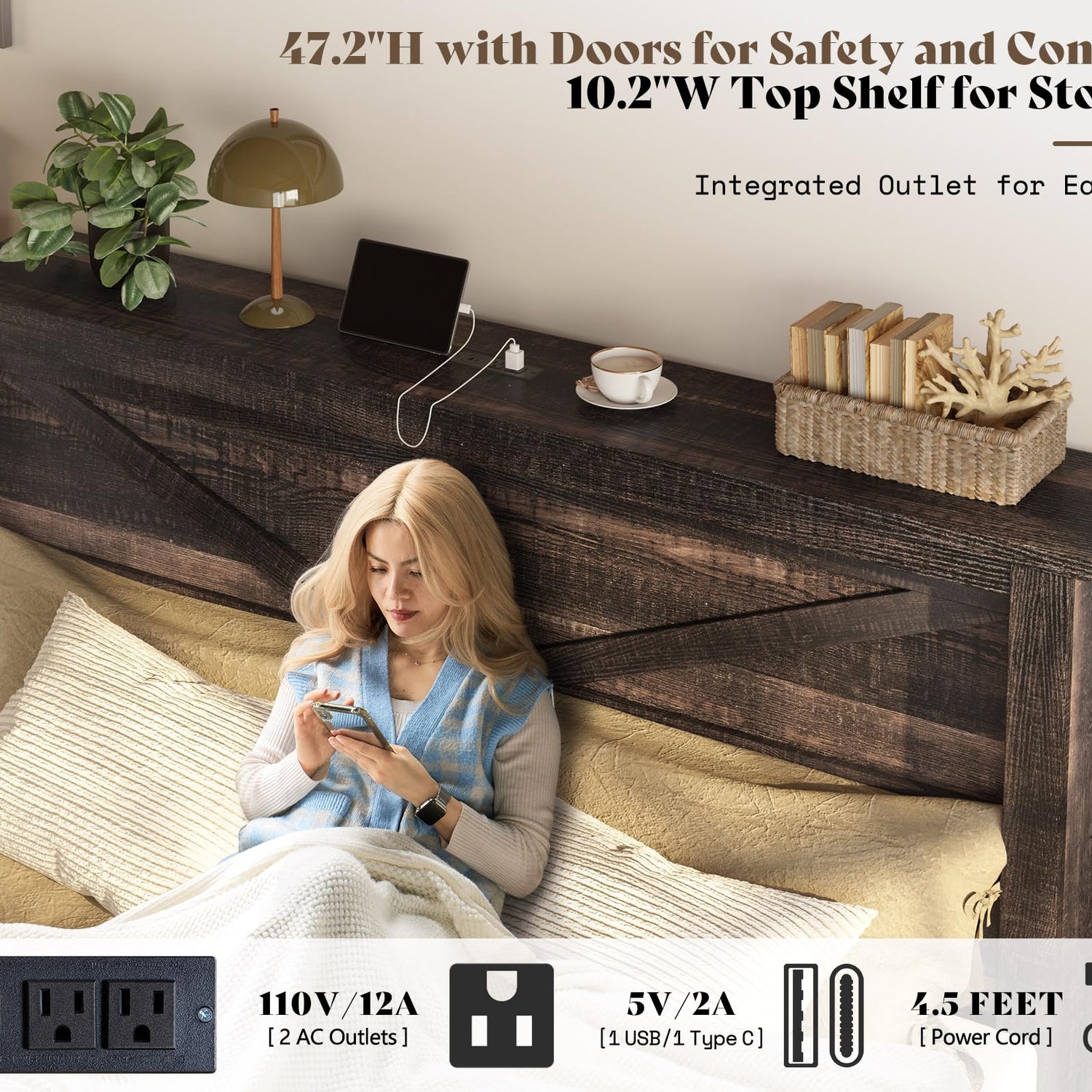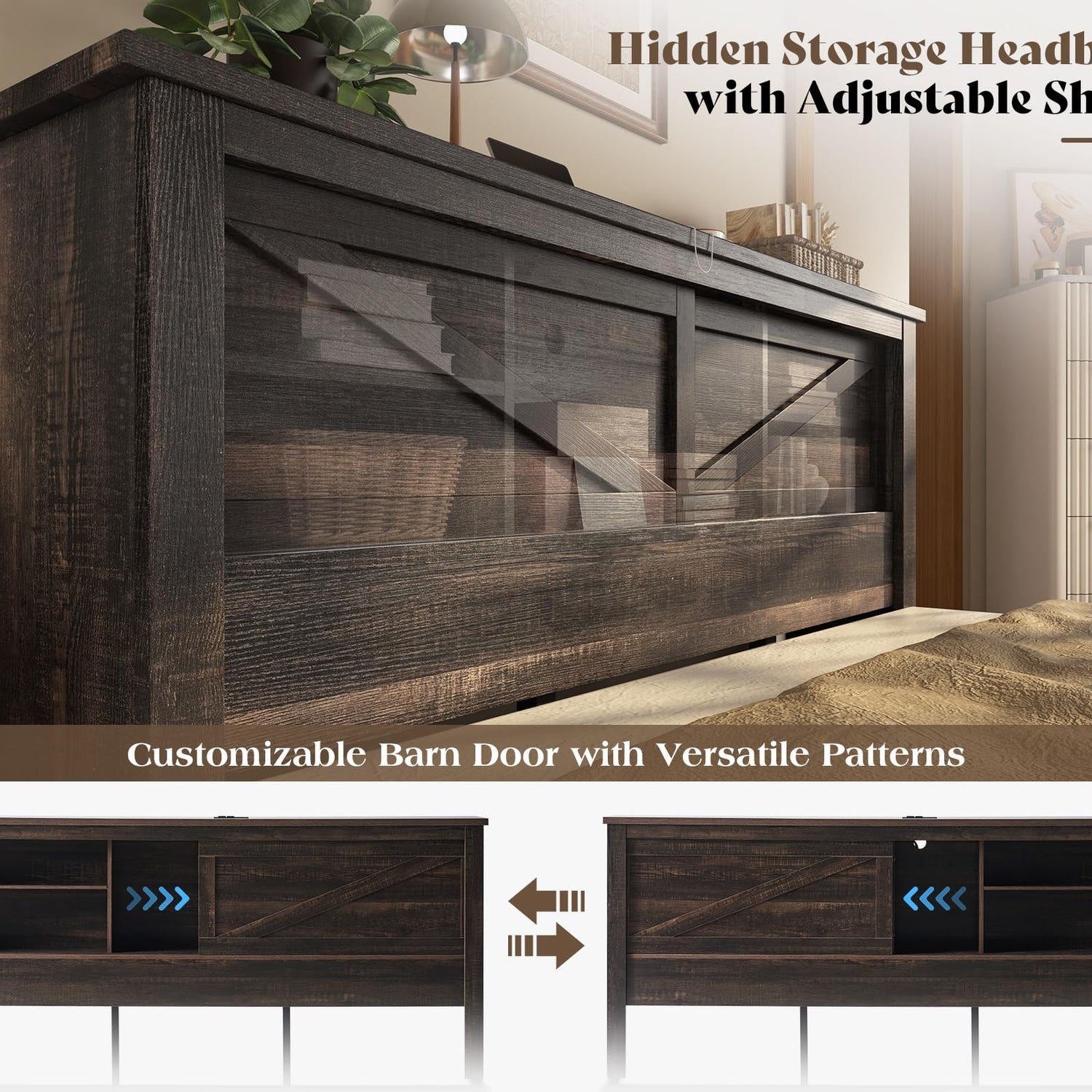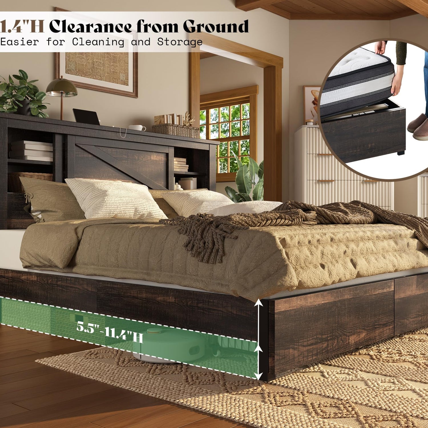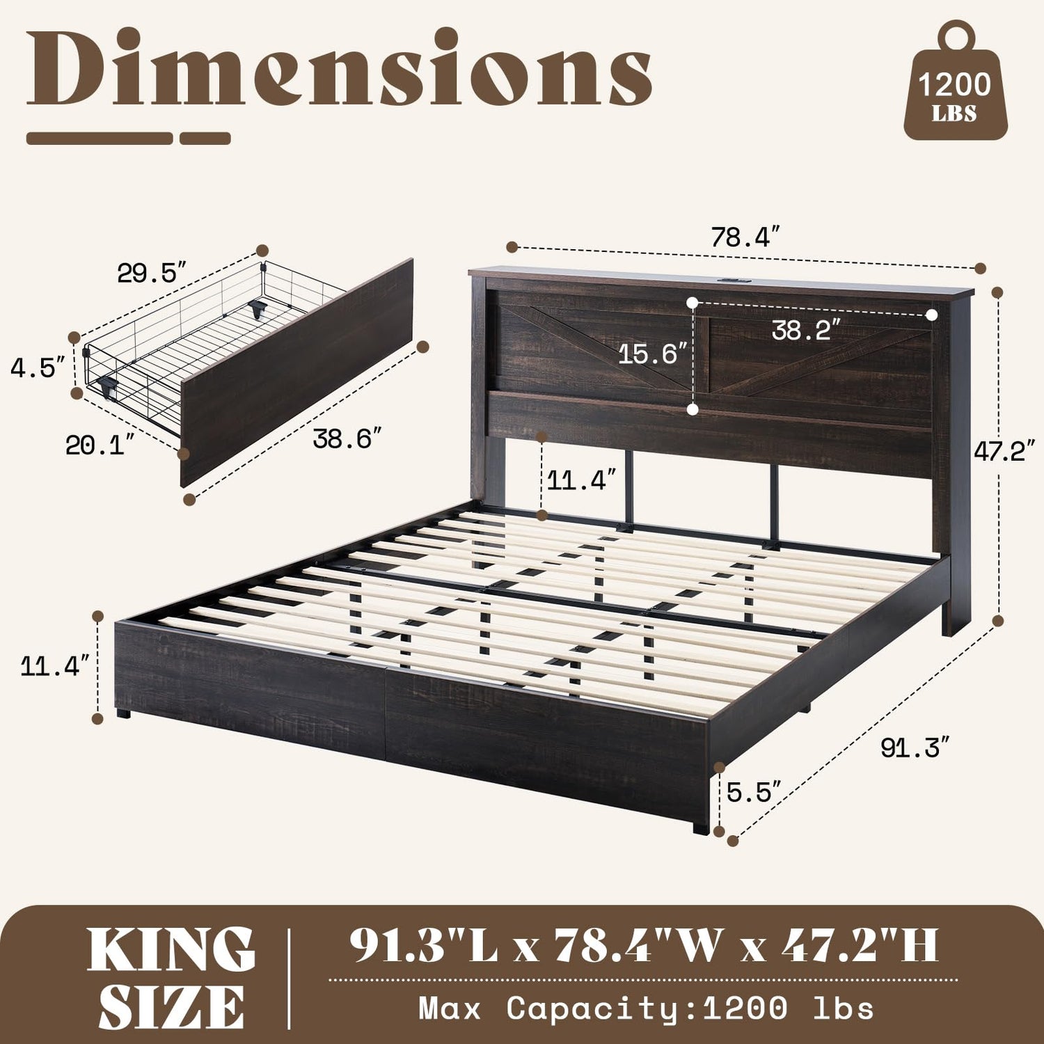 AMERLIFE 47.2" H King Bed Frame with Hidden Space Bookcase Headboard and Charging Station, Beds with 2 Storage Drawers and Wood Slats, No Box Spring Needed, Dark Oak