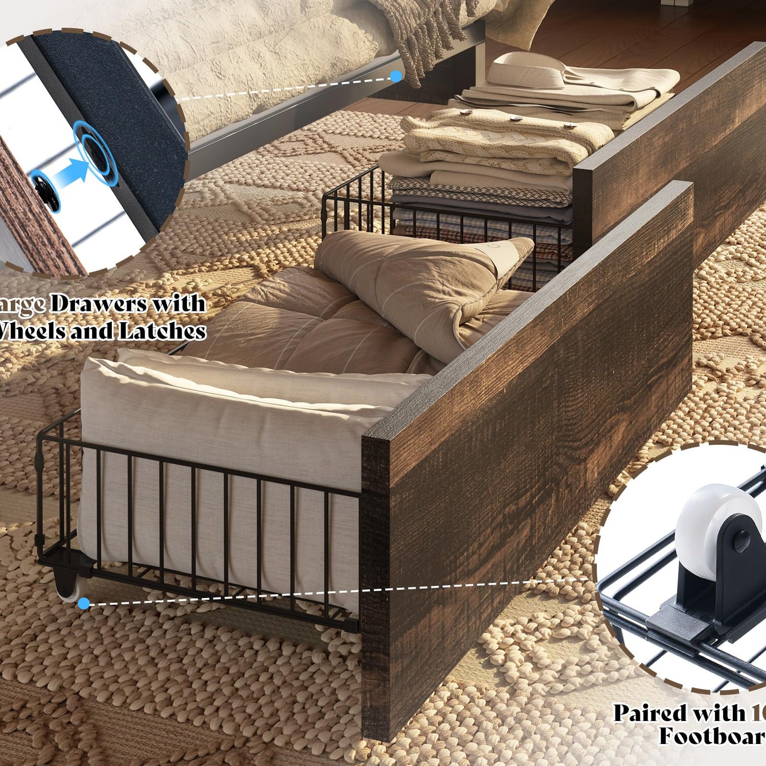 - [Convenient Storage] With a 10.2" W top shelf on the headboard, you can securely store your essentials. The headboard also features 2 standard plug outlets, 1 USB port, and 1 Type-C port. Additionally, 2 drawers provide extra dust-free storage space