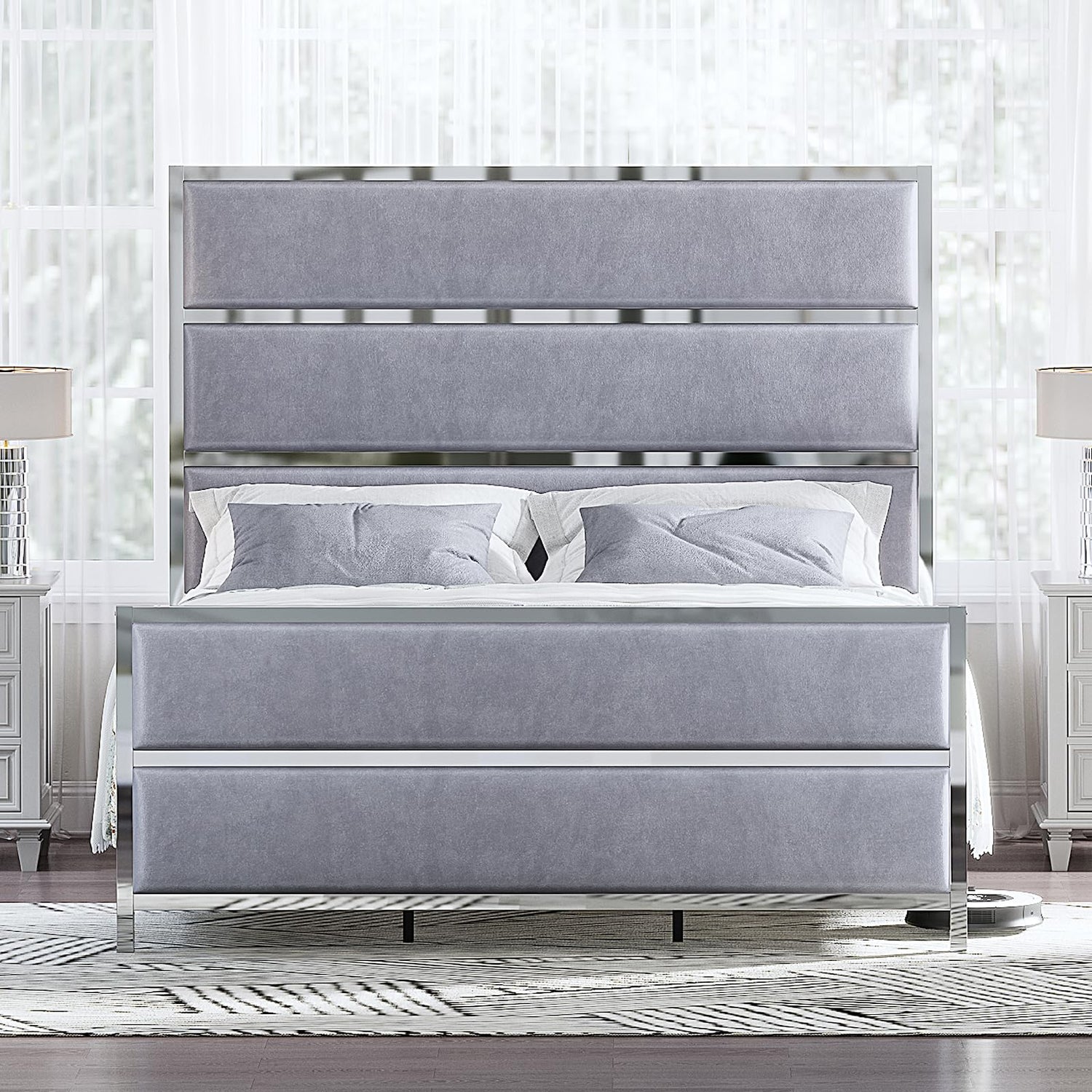 AMERLIFE 59" King Size Bed Frame, Velvet Upholstered Bed with Silver Trim Headboard & Footboard, Channel Tufted Platform Bed Frame, No Box Spring Needed/Light Grey