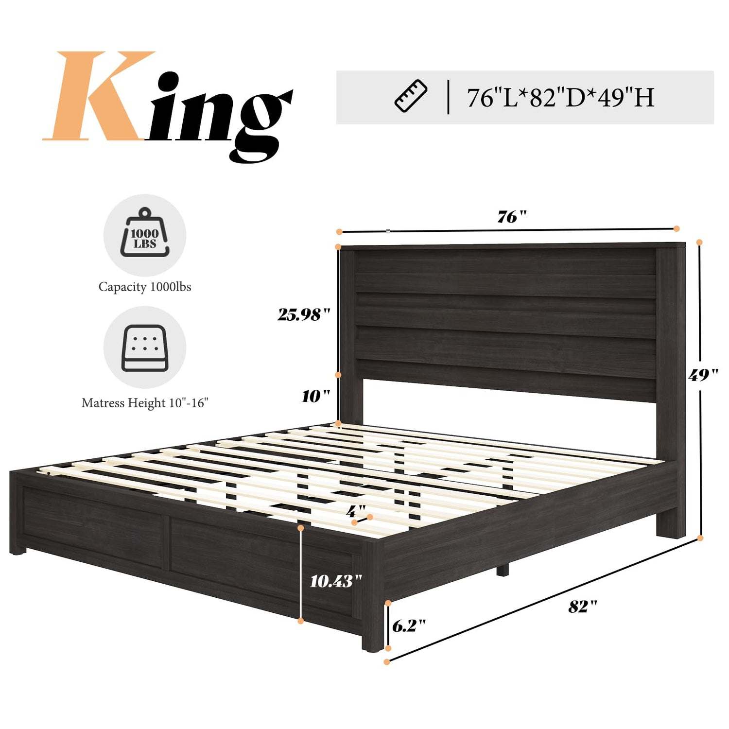 AMERLIFE Farmhouse King Size Bed Frame with 49" Fluted Headboard, Wood Platform Bed with Natural Grain, No Box Spring Needed/Noise Free, Black