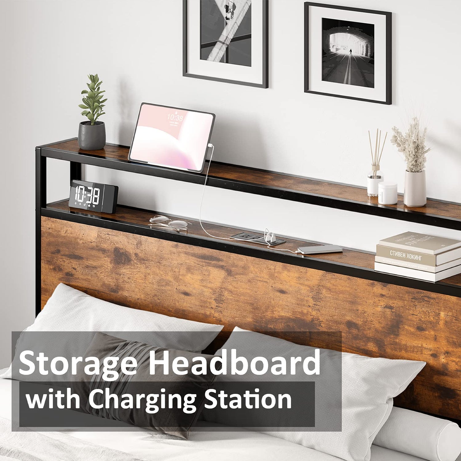 AMERLIFE Full Size Bed Frame, Industrial Platform Bed with Charging Station, 2-Tier Storage Headboard/No Box Spring Needed/Noise-Free/Dark Brown