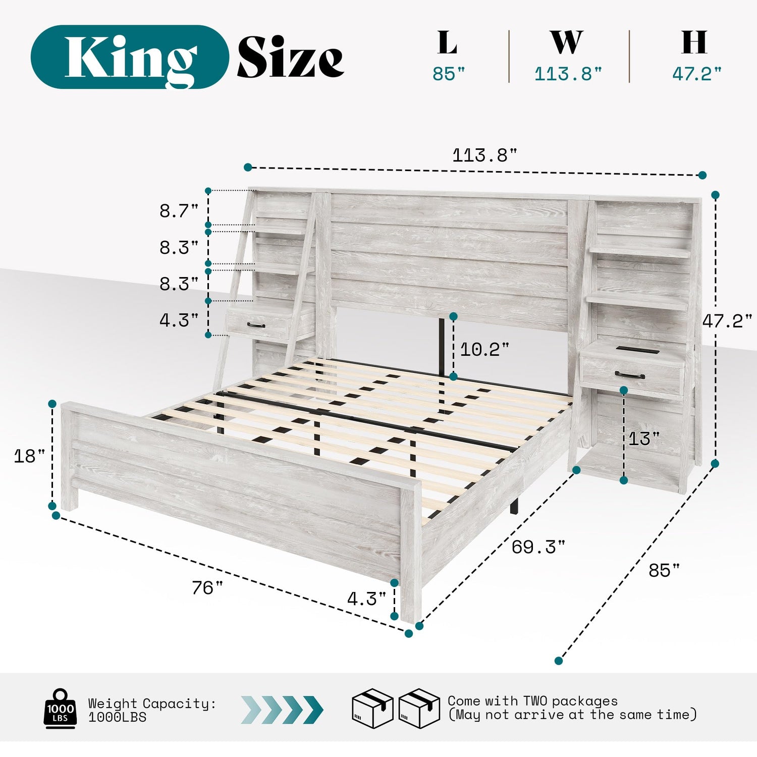 AMERLIFE King Bed Frame with Wide Headboard and 4-Tier Bookshelves, Farmhouse Platform Bed with Charging Station & 2 Drawers, Noise-Free, No Box Spring Needed, Rustic White