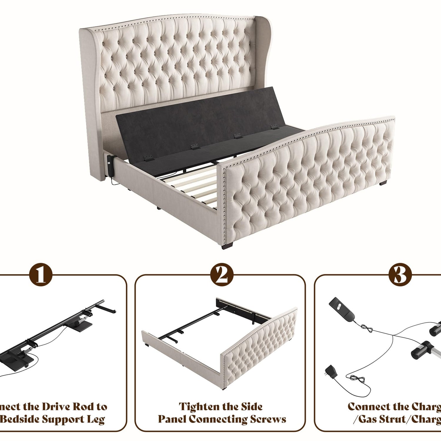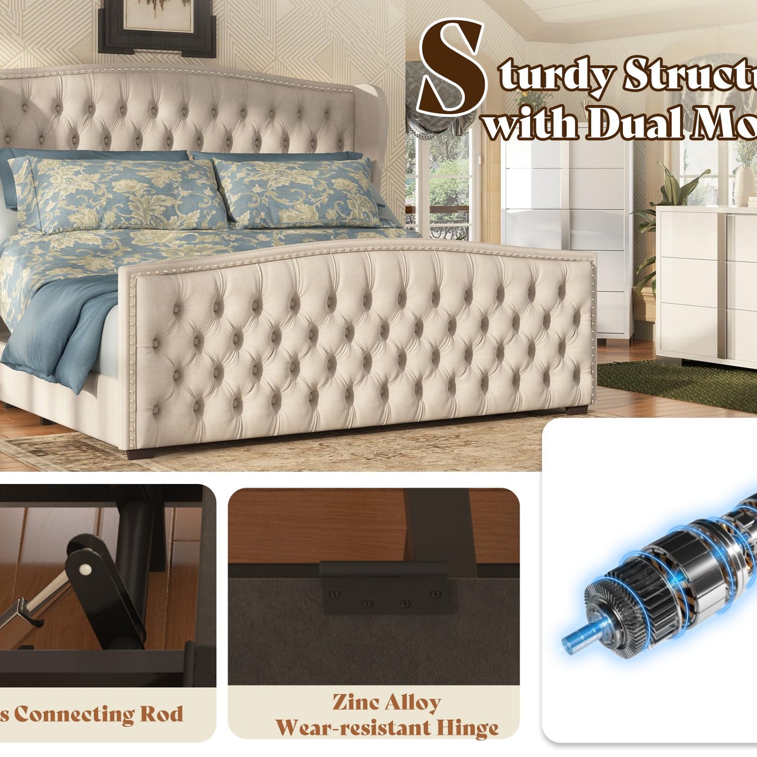 AMERLIFE King Size Adjustable Bed Frame with 51" H Velvet Upholstered and Deep Button Tufted Headboard, Electric Bed with Dual Motor/Nailhead Trim Wingback, No Box Spring Needed, Cream
