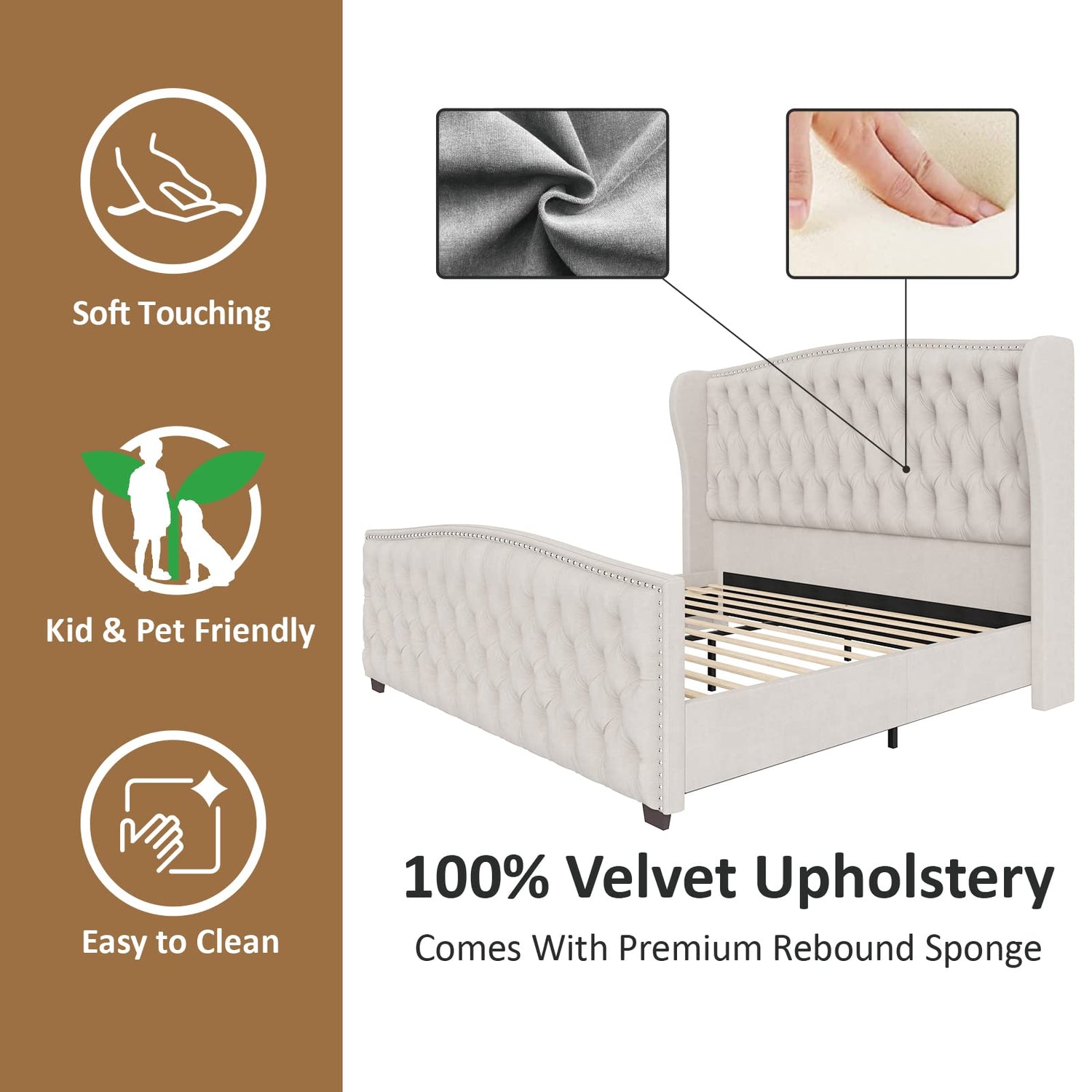 AMERLIFE King Size Platform Bed Frame, Velvet Upholstered Bed with Deep Button Tufted & Nailhead Trim Wingback Headboard/No Box Spring Required/Cream