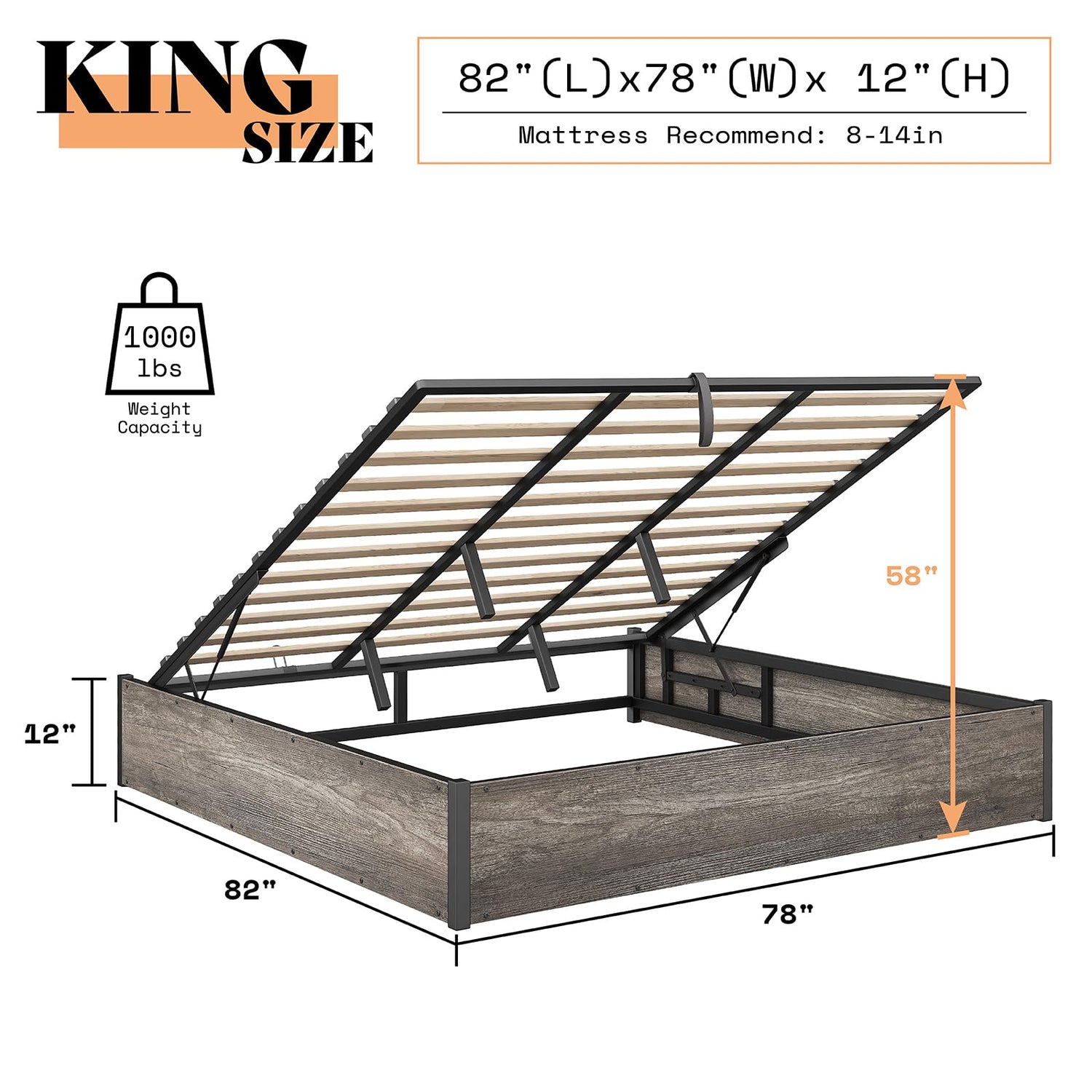 AMERLIFE Lift Up Storage Bed, King Bed Frame with Storage Underneath, Wooden Platform Bed Frame, Solid Wood Slats Support, No Fixed Headboard, No Box Spring Needed, Rustic Grey