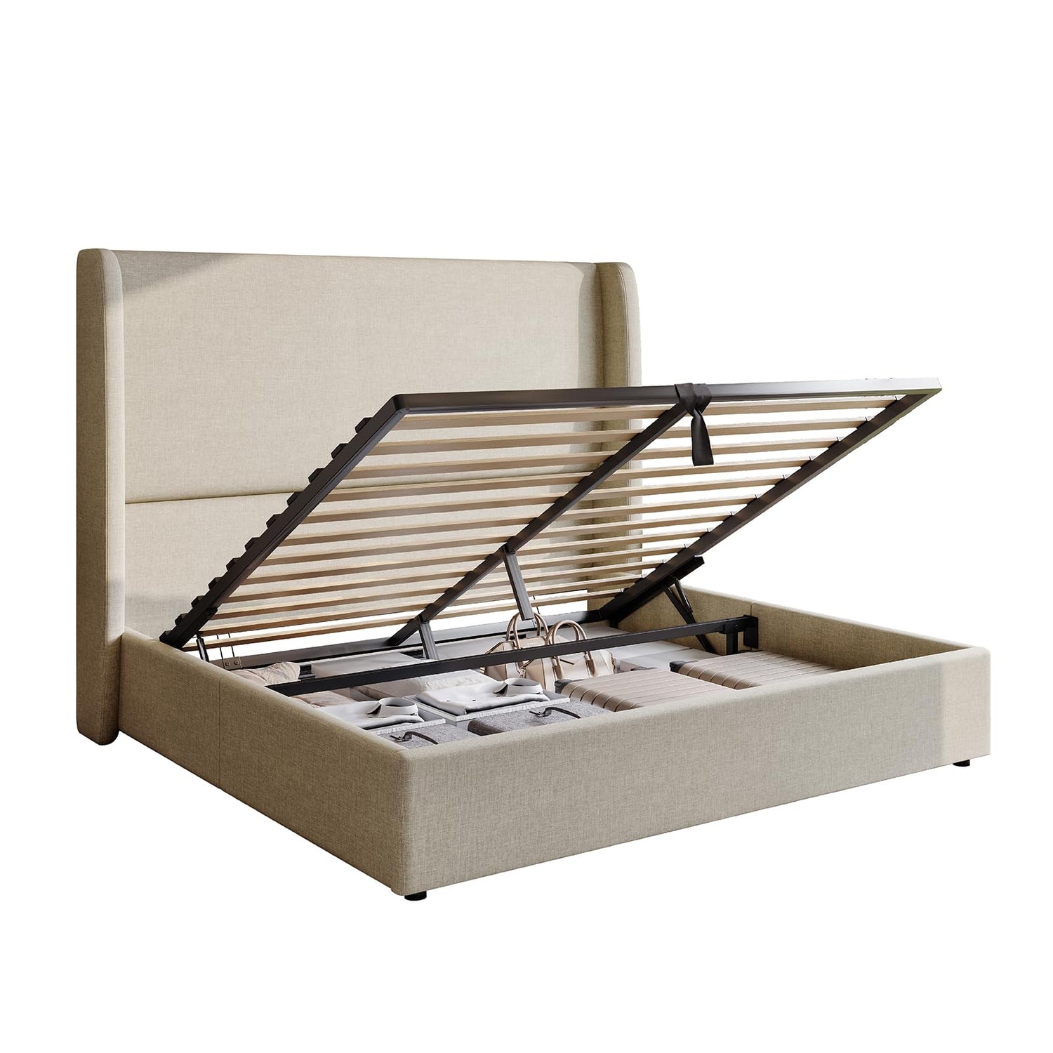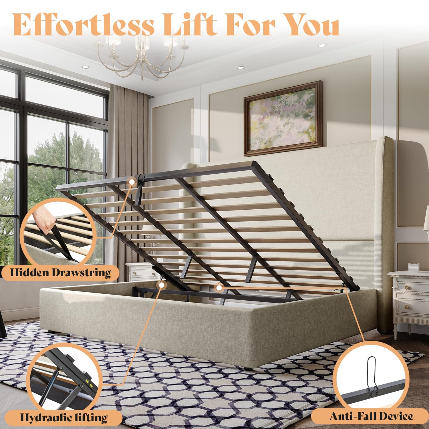 AMERLIFE Lift Up Storage Bed Queen Size Linen Upholstered Platform Bed Frame, Hydraulic Storage,Modern Wingback Headboard, No Box Spring Needed, Khaki