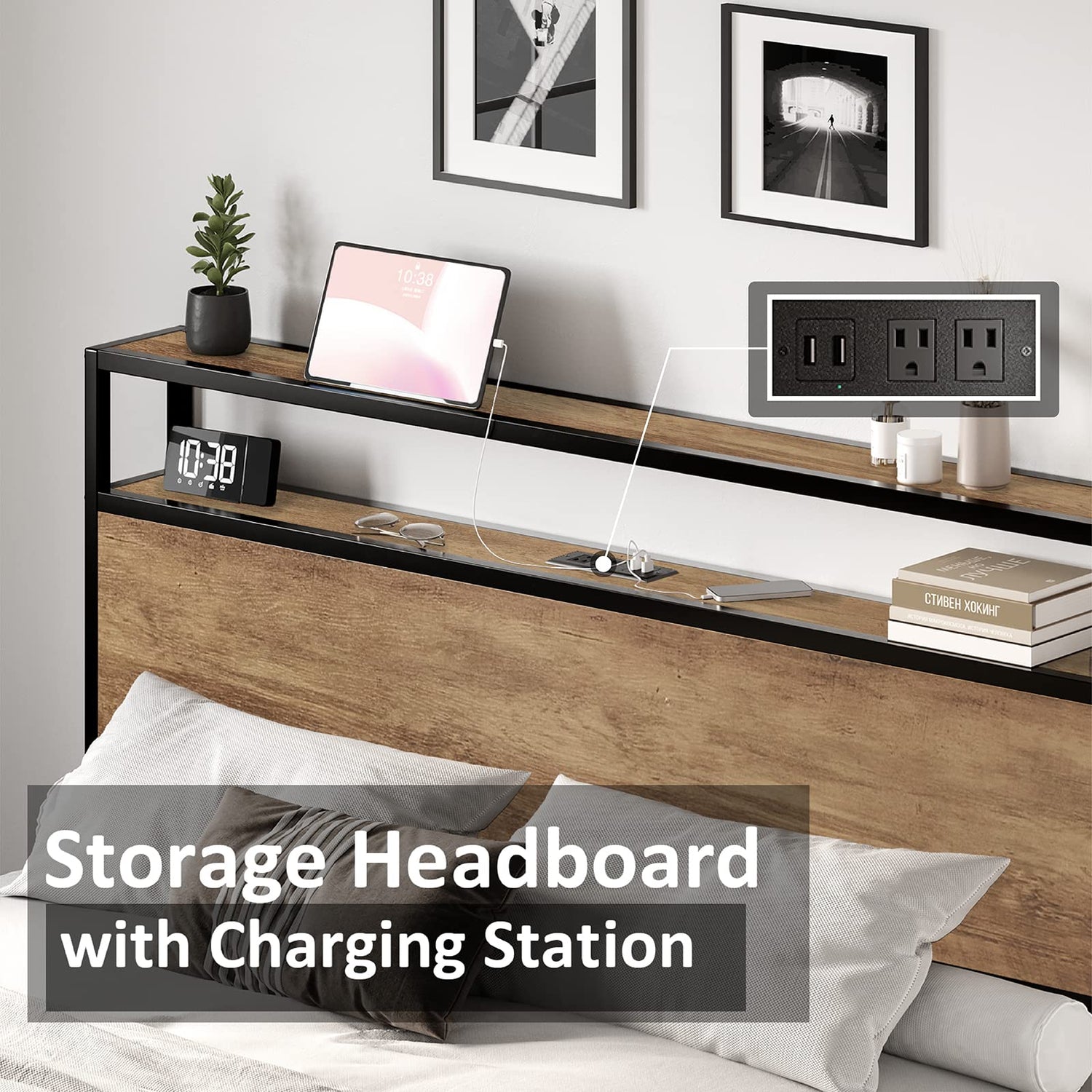 AMERLIFE Queen Size Bed Frame Industrial Platform Bed with Charging Station, 2-Tier Storage Headboard/No Box Spring Needed/Noise-Free/Rustic Brown