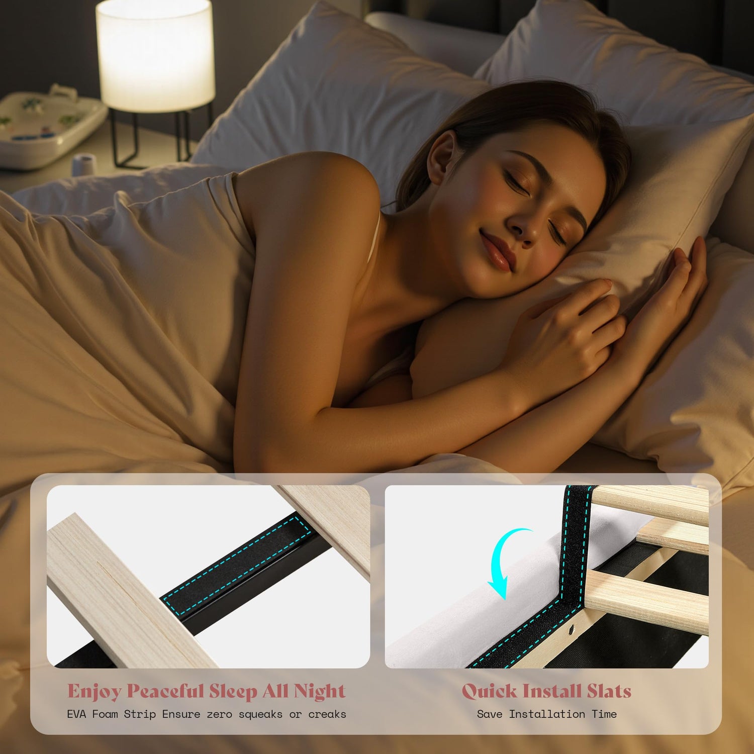- Stable Platform Frame: Built with a one-piece headboard, solid wood slats, and central metal legs, the frame offers firm support up to 1000 lbs—no box spring required.