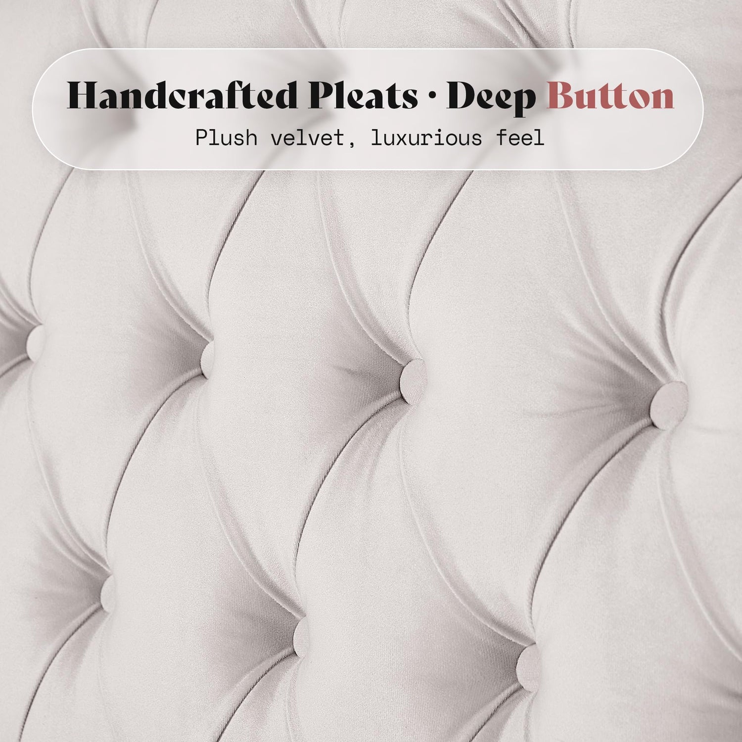 - Hand-tufted Deep Diamond: Covered in soft cream velvet, the headboard showcases hand-tufted diamond buttons and pleated details for a tailored, luxurious look that feels custom-made.