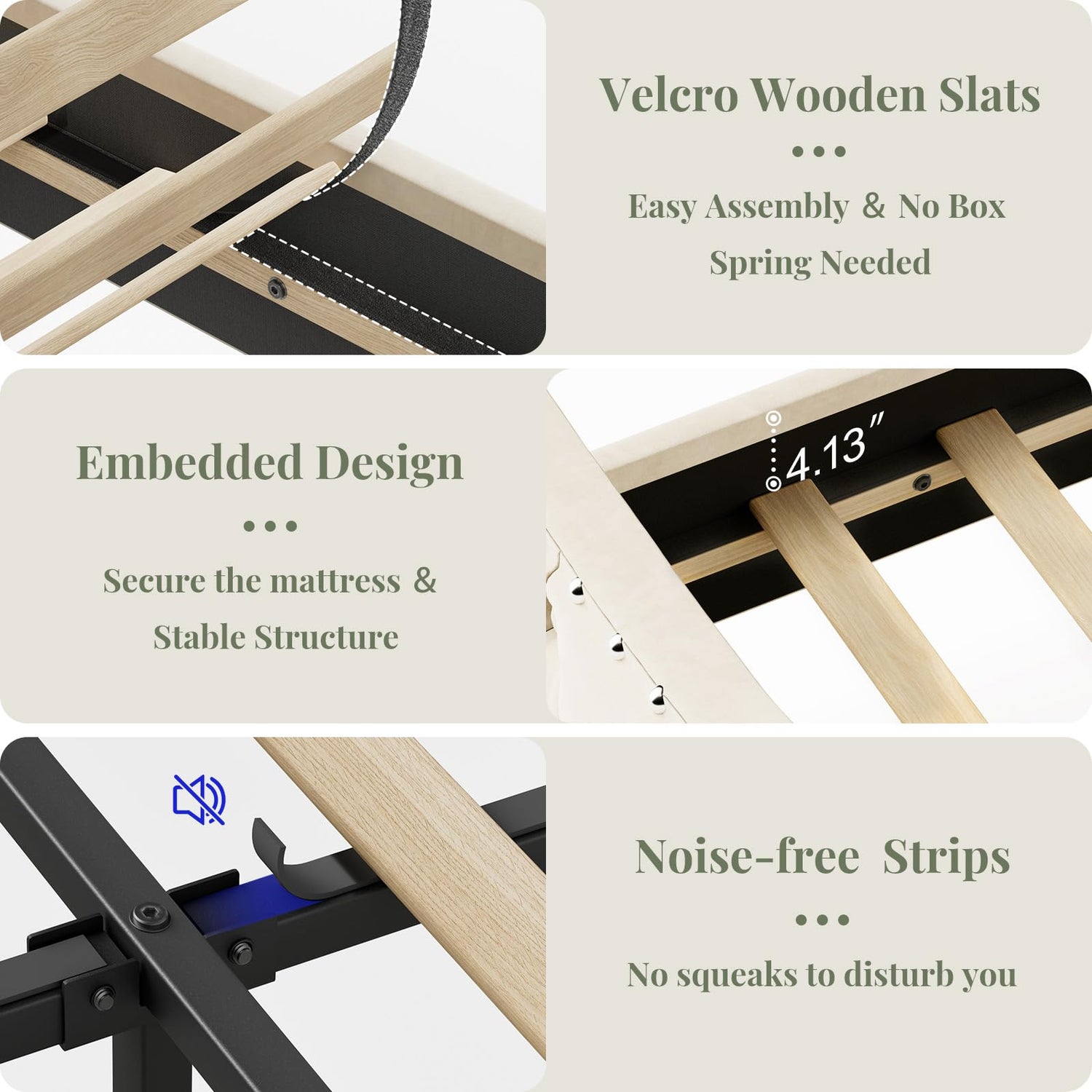 - Sturdy No-Noise Construction -- Built with 12 solid wooden slats and a heavy-duty metal frame, this bed supports up to 1000 lbs without the need for a box spring. EVA foam strips and Velcro-secured slats eliminate squeaks and vibrations, while thick legs enhance stability and protect floors. The 4.3" under-bed clearance allows easy cleaning with a robot vacuum