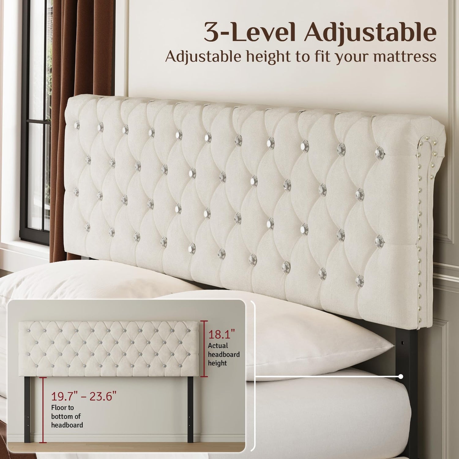 - Adjustable Height Headboard: The diamond headboard is adjustable. The adjustable height is 7”.9-11.8”. You can change the height according to your different needs. (The frame and slats, both made from FSC-certified wood, constitute over 50% of the product)