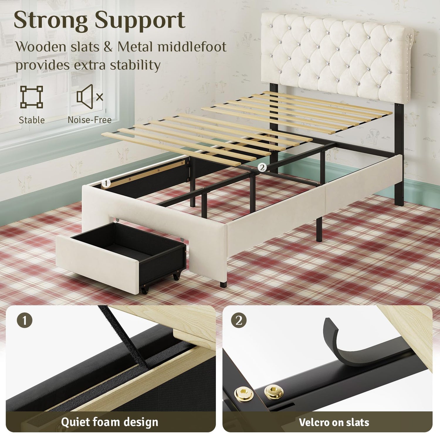 Belffin Twin Size Bed Frame with 1 Storage Drawer, Upholstered Bed Frame with Adjustable Diamond Headboard, Velvet Modern Platform Bed Frame, No Box Spring Needed, Easy to Assemble, Beige