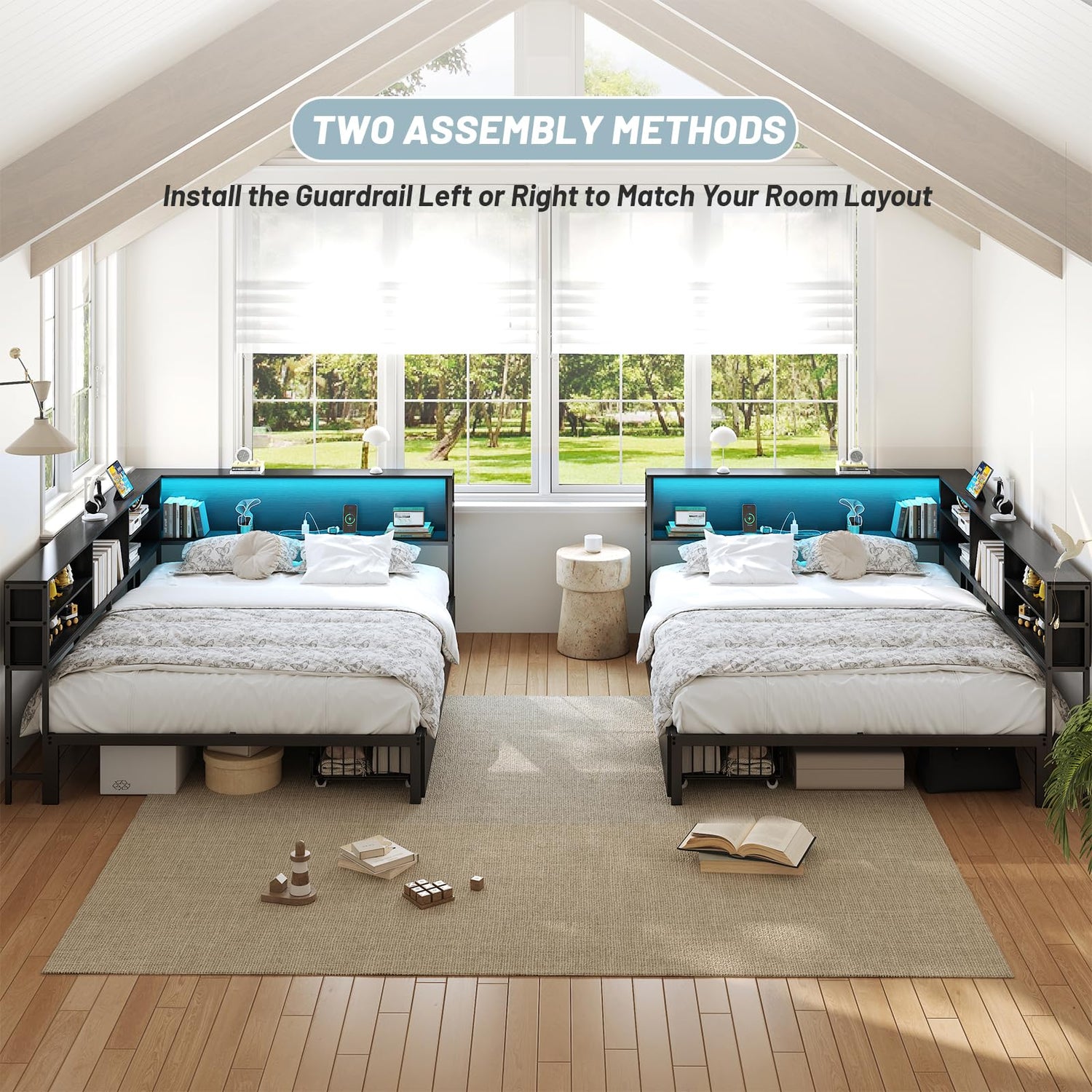 - [Corner Bed Frame with Storage Drawers] Equipped with 2 large-capacity storage drawers under the bed frame. Each has 4 smooth wheels that can be easily pulled out and closed, making it easy to store all kinds of bed linen, clothes, etc. Each drawer is also designed with a closing buckle, that prevents closed drawers from opening indiscriminately.