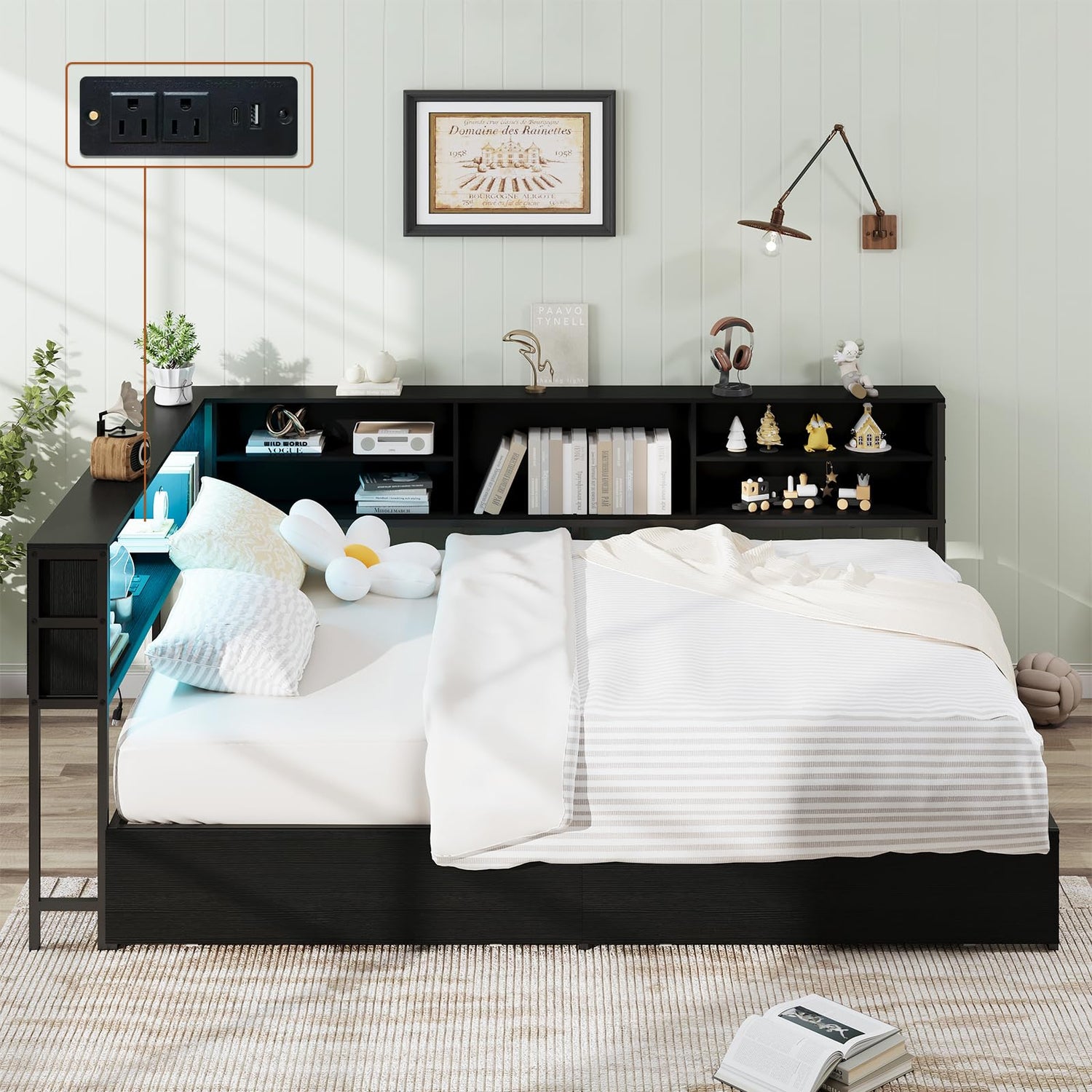 - [Daybed with Bookcase and Shelves] The integrated storage headboard and bookcase side rails work wonders for calming clutter, Ideal for avid young readers, this kid's bedroom corner bed unit makes it easy to grab your favorite book from the comfort of your bed.