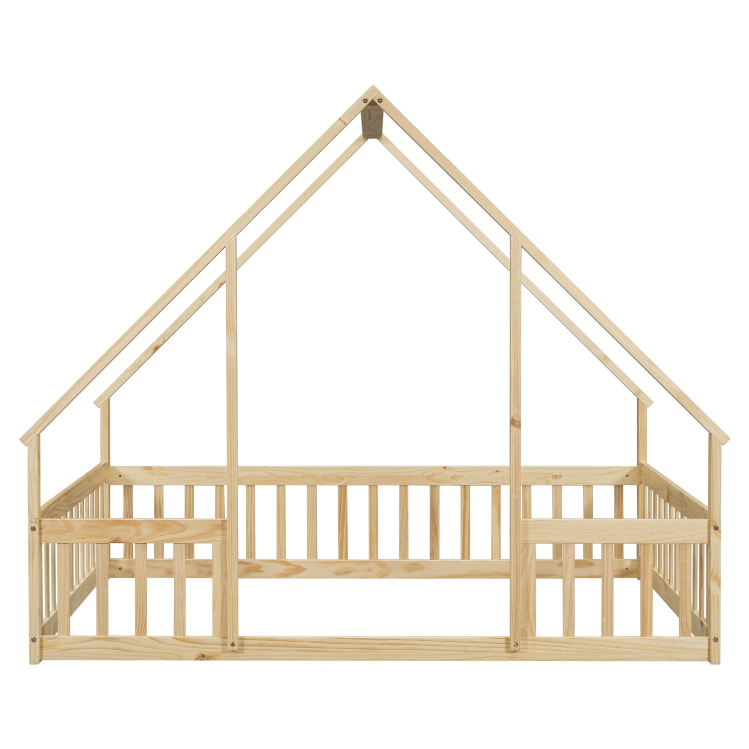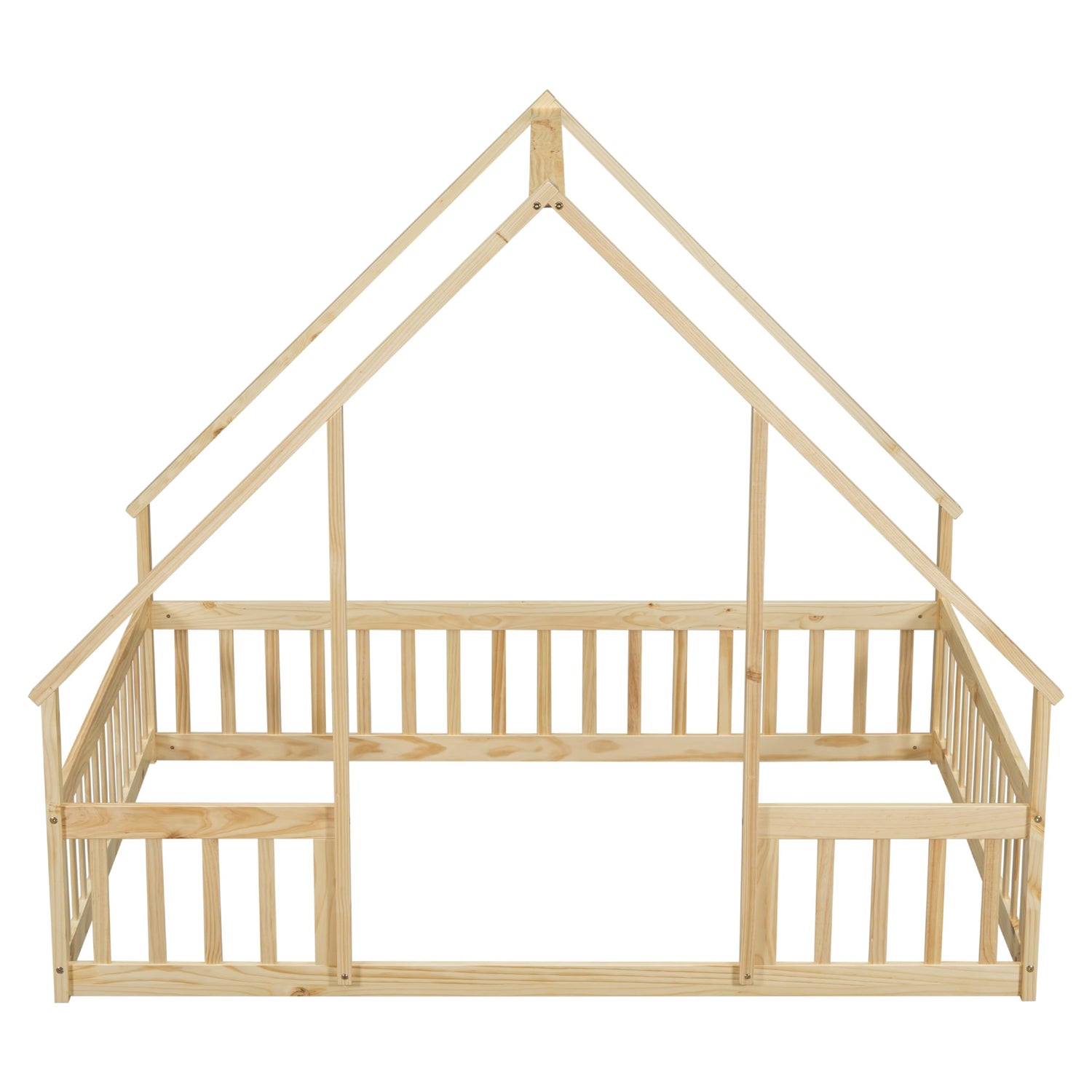 Bellemave Full Size Natural Montessori House Bed with Fence Rails for Kids