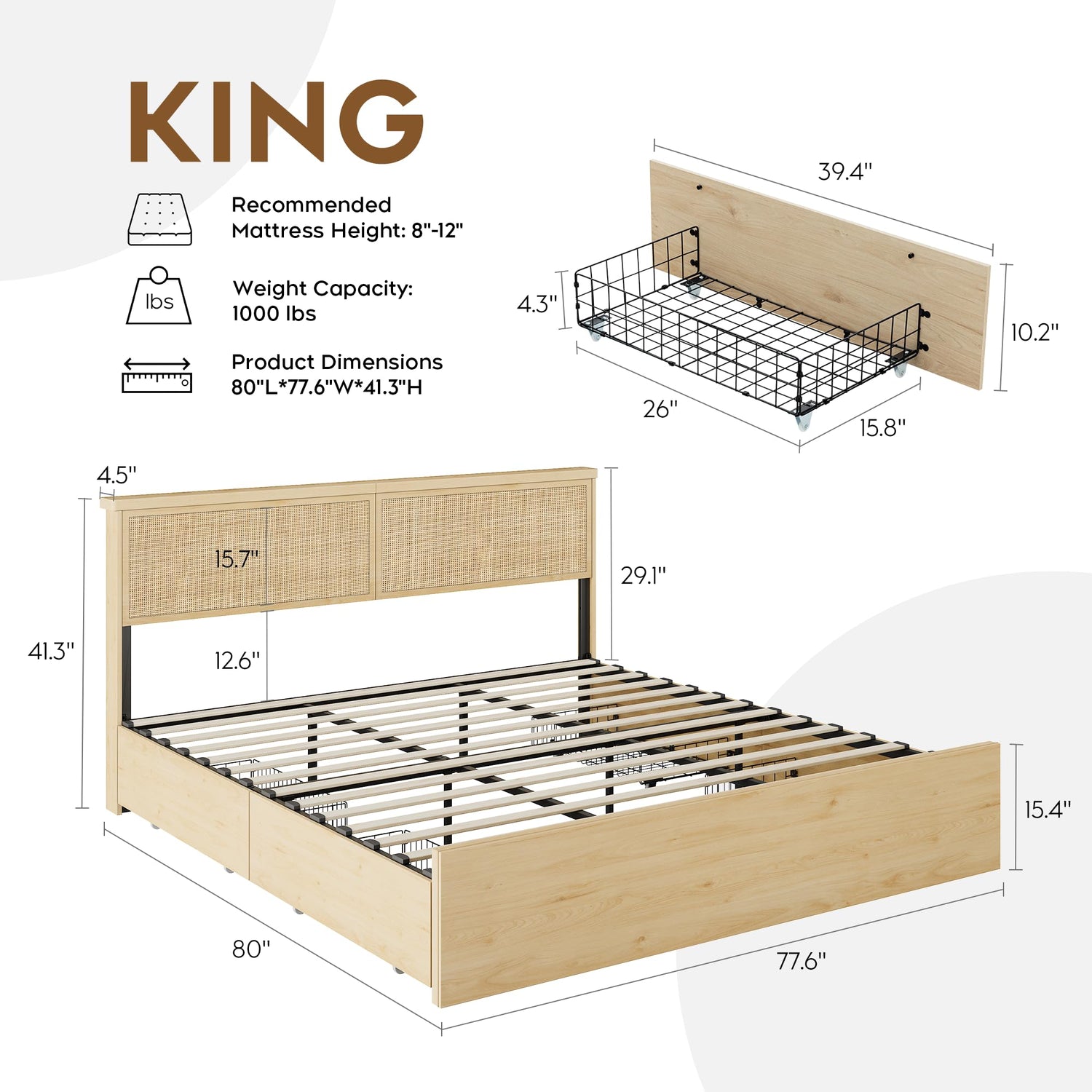 - Premium Materials for Long-Lasting Durability: Constructed with high-quality MDF, a sturdy metal frame, and a natural rattan headboard, this king-size bed is built to last. The eco-friendly materials are free from odors, ensuring a fresh and comfortable sleeping environment. Reinforced with additional center support legs and solid headboard and footboard construction, this bed provides superior strength and stability, preventing sagging or deformation over time.