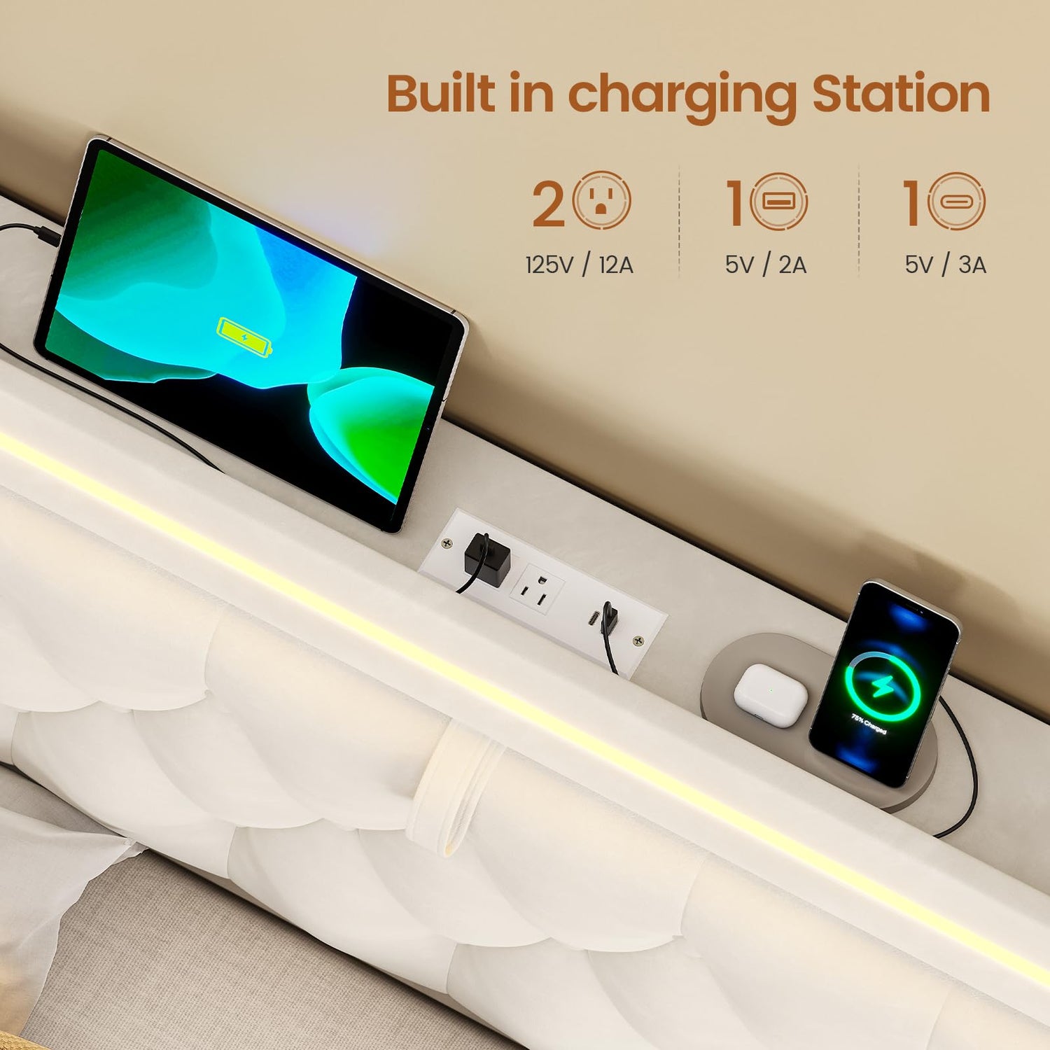 - Large Storage Headboard Bulit-in Charging Station: Hidden storage headboard and customzied storage shelf provding ample storage space for organzied your essentials. Buliy-in 2 power outlet & 1 usb ports & 1 type-c ports, offering convenient charging for your phone, two sides pockets also practical, perfect for keeping your remote.