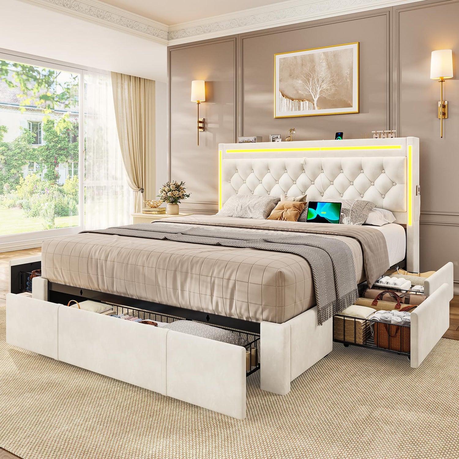 BTHFST Upholstered LED Bed Frame Queen Size with 5 Storage Drawers, Hidden Storage Headboard with Charging Station, Velvet Button Tufted Headboard Platform Bed, Beige