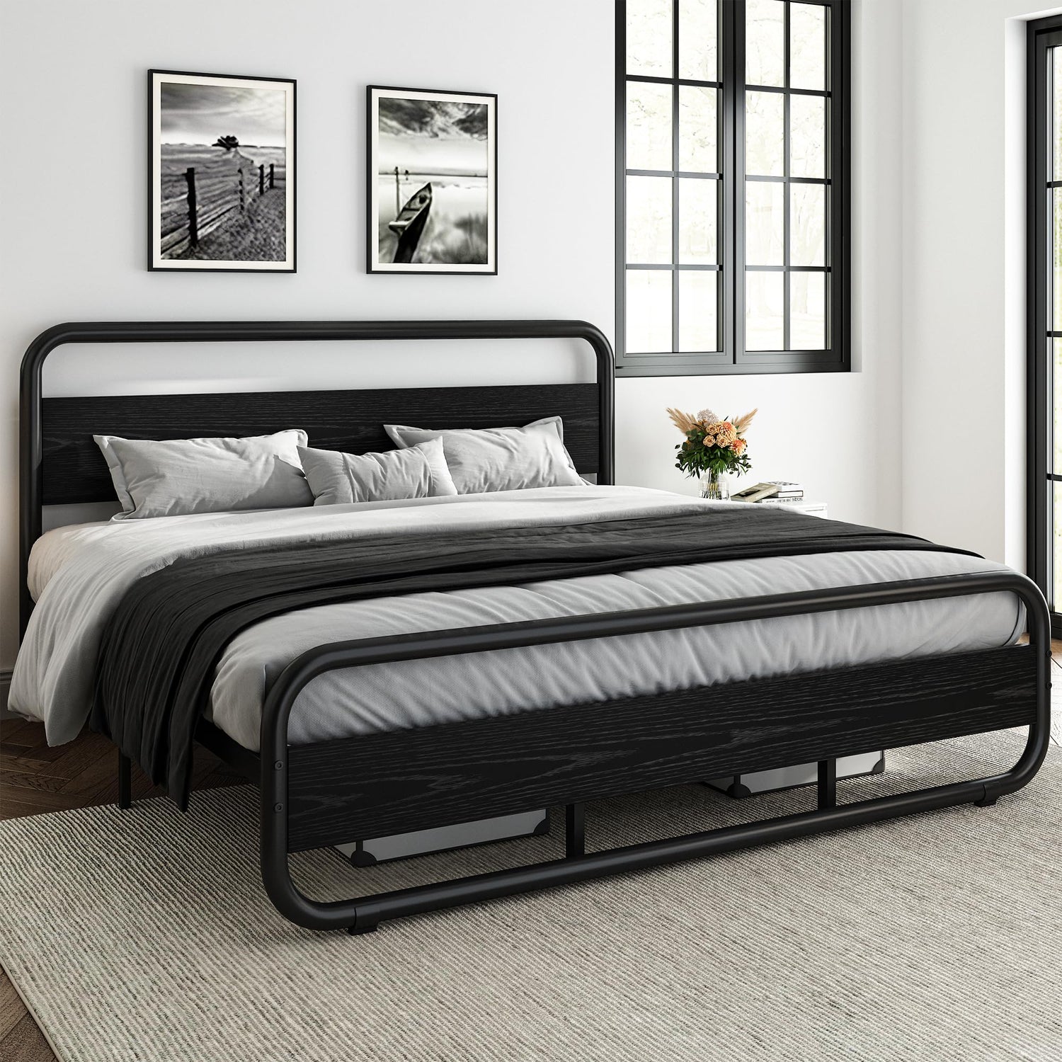 Catrimown King Size Bed Frame, Heavy Duty Metal Rustic King Platform Bed Frame with Wood Headboard, Under Bed Storage, Noise Free, No Box Spring Needed, Black