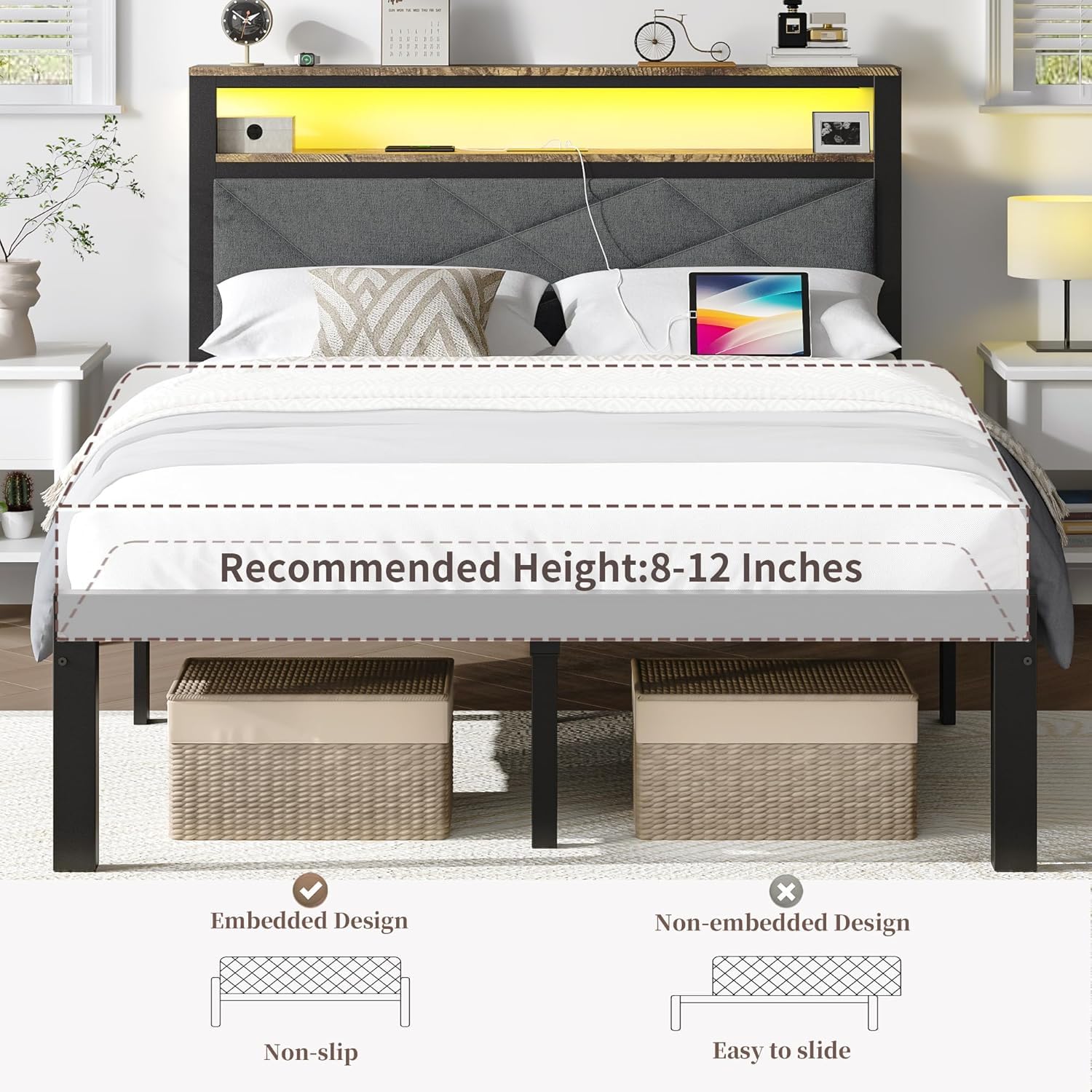 ChicZhiNest Full Bed Frame with Charging Station, LED Lights, Heavy Duty Metal Slats, Headboard with Upholstered Back and Storage Shelves, No Box Spring, Noise-Free, Easy Assembly, Dark Gray