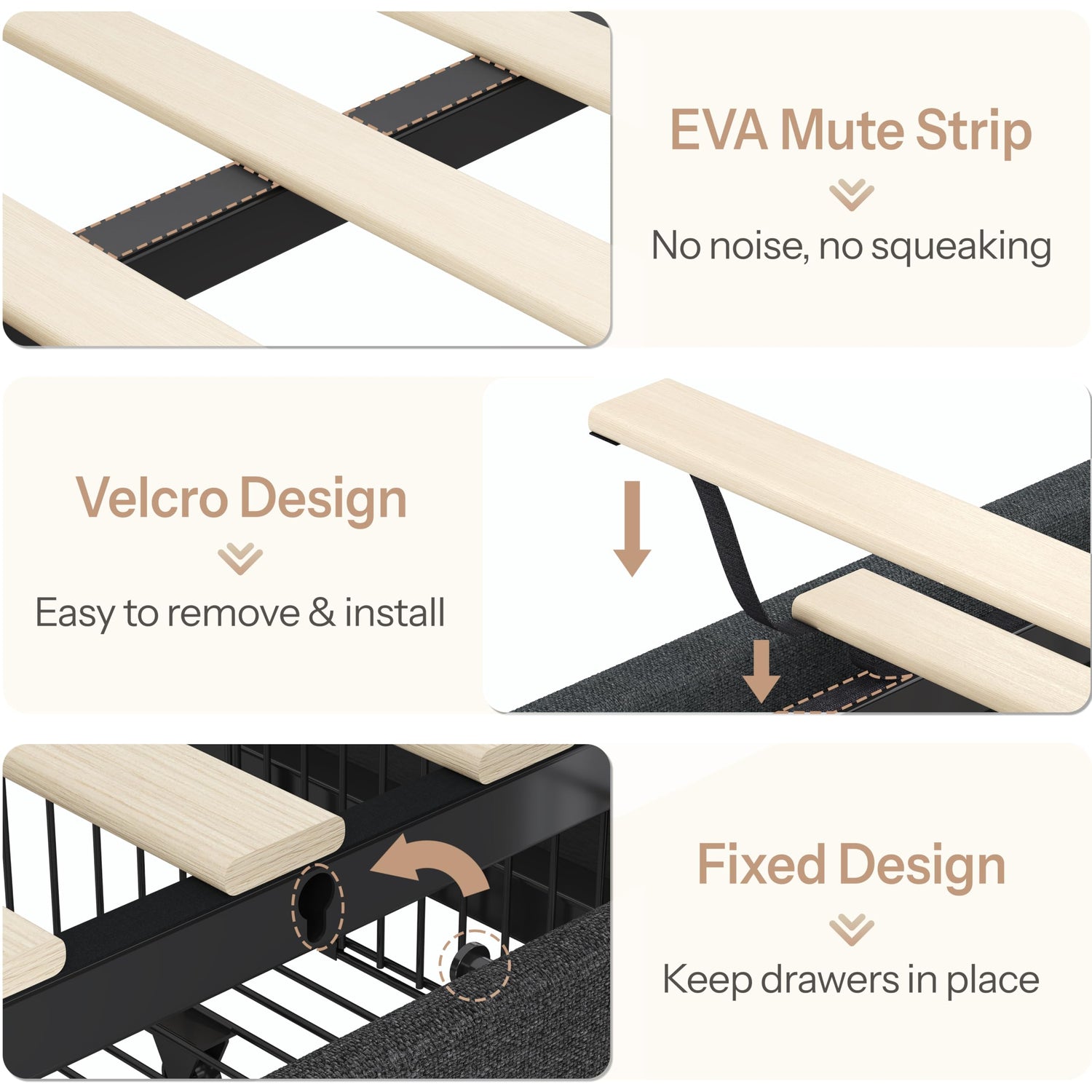 • Sturdy & Noise-Free: Crafted with a solid wood slat system and a heavy-duty queen upholstered platform bed frame for superior stability and durability. EVA mute strip and plastic foot mats reduce friction noise and protect your floors, ensuring a quiet and scratch-free experience
