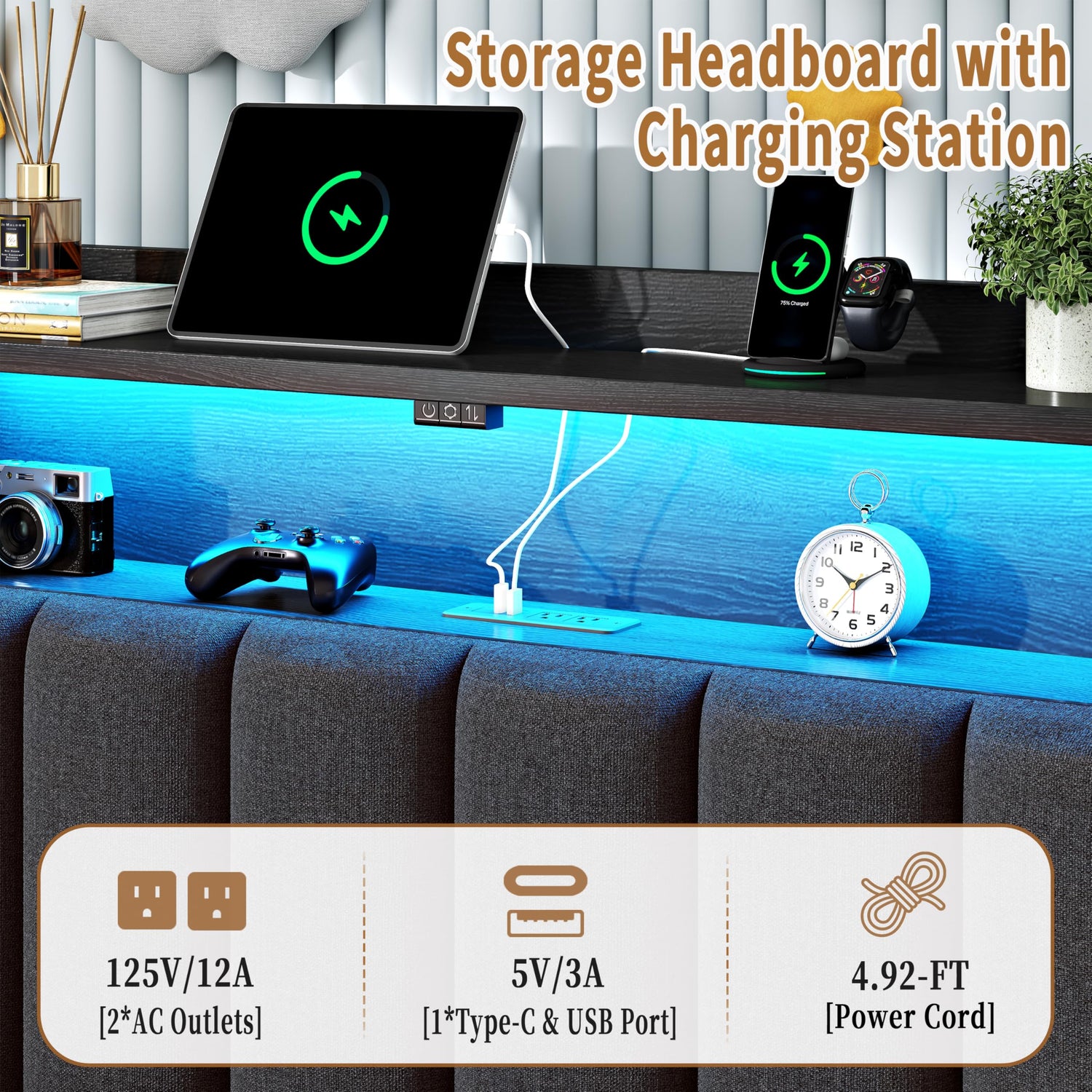 ChicZhiNest Queen Bed Frame with 2 Storage Drawers & Large Footboard Cabinet, LED Lights & USB Charging Station, Linen Upholstered Platform Bed with Headboard, No Box Spring Needed, Dark Grey