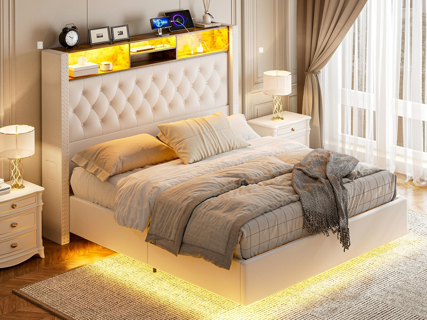 Floating Queen Size Bed Frame with Velvet Upholstery, Storage Headboard & LED Lights by CIKUNASI