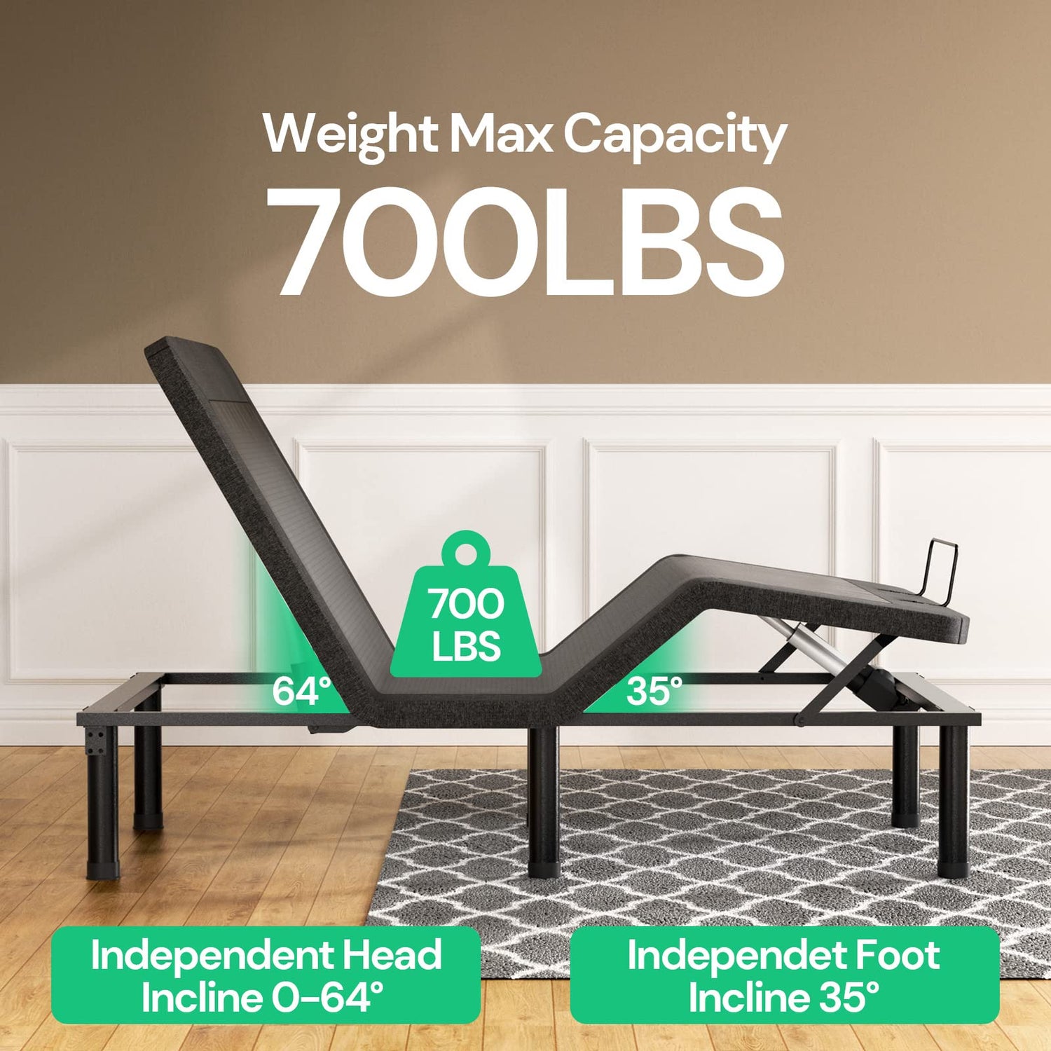 • Wireless Remote Electric Adjustable Bed Frame: Enjoy effortless control with the wireless remote, allowing you to adjust the head (0°-64°) and foot (0°-35°) incline of your king size adjustable bed frame. Perfect for reading, watching TV, or achieving a zero-gravity sleep position for ultimate comfort