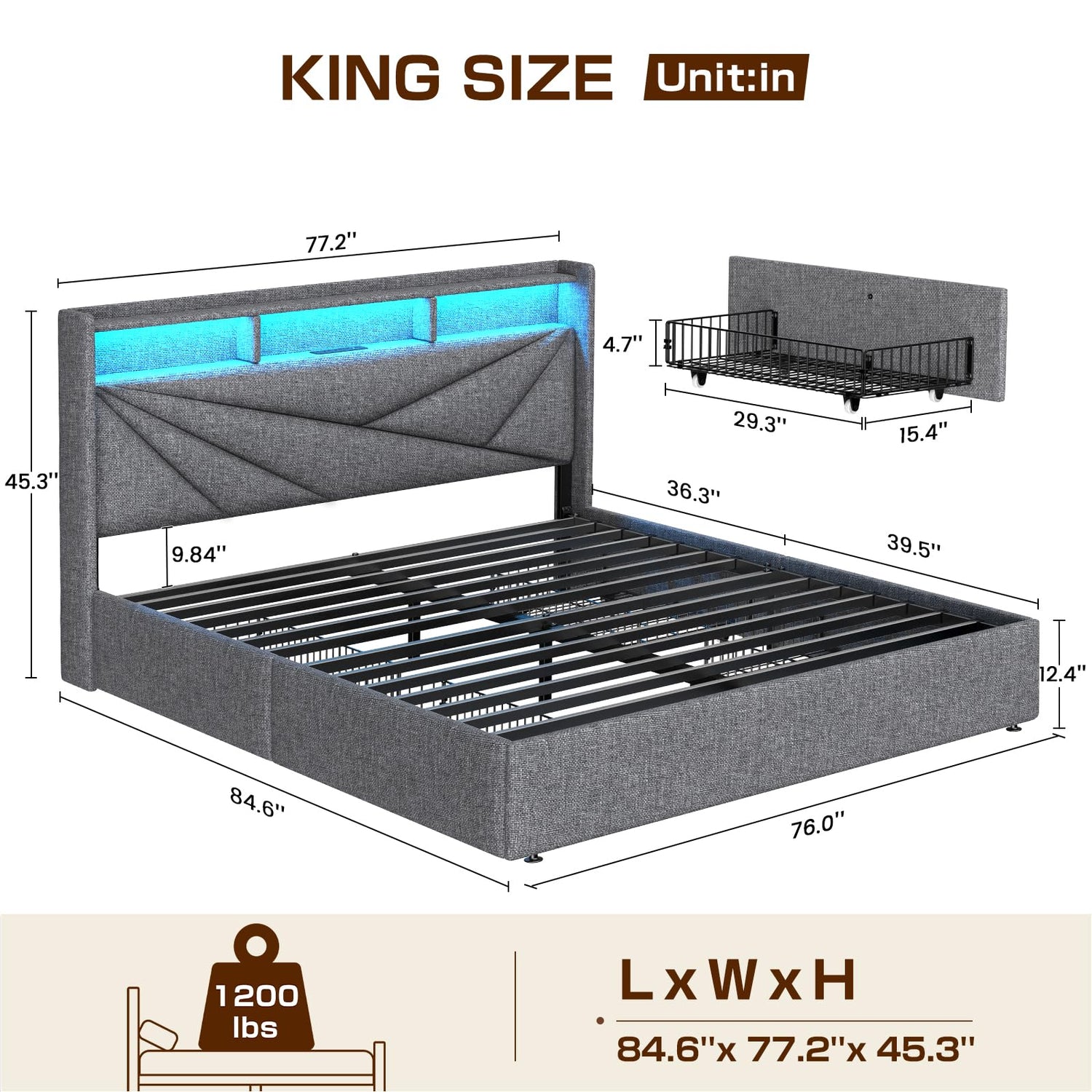 Driftalia King Size Upholstered Bed Frame with LED Lights and 4 Storage Drawers - Light Grey