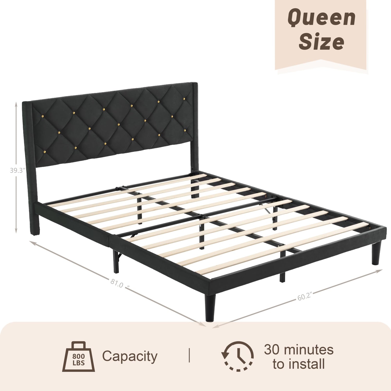DUMGTIF Queen Size Platform Bed Frame with Velvet Upholstered Headboard and Sturdy Wooden Slats Support,Mattress Foundation,Easy Assembly, No Box Spring Needed,Slip Resistant (Black, Queen)