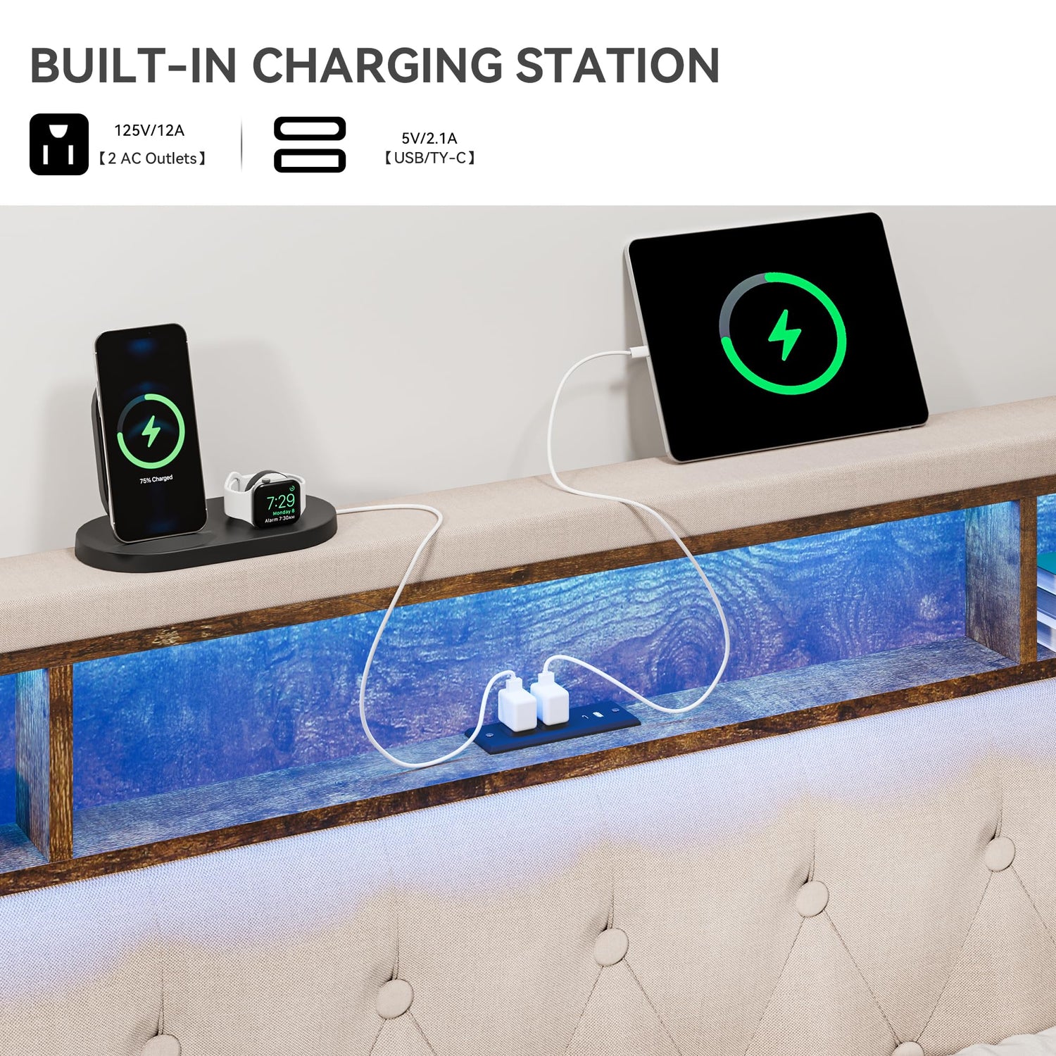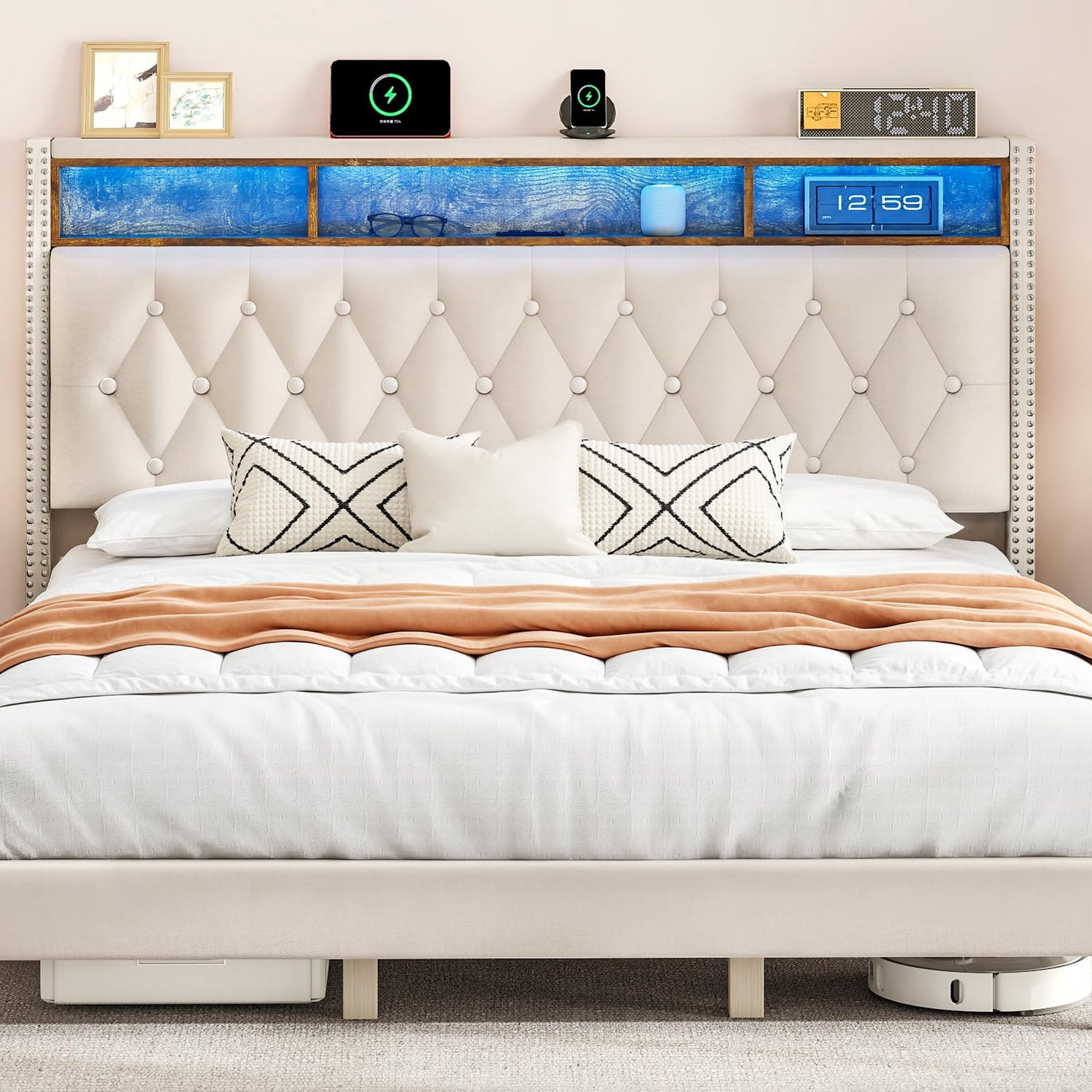 DWVO King Bed Frame with Upholstered Headboard, Platform Bed Frame with LED Lights & Charging Station, No Box Spring Needed, Beige