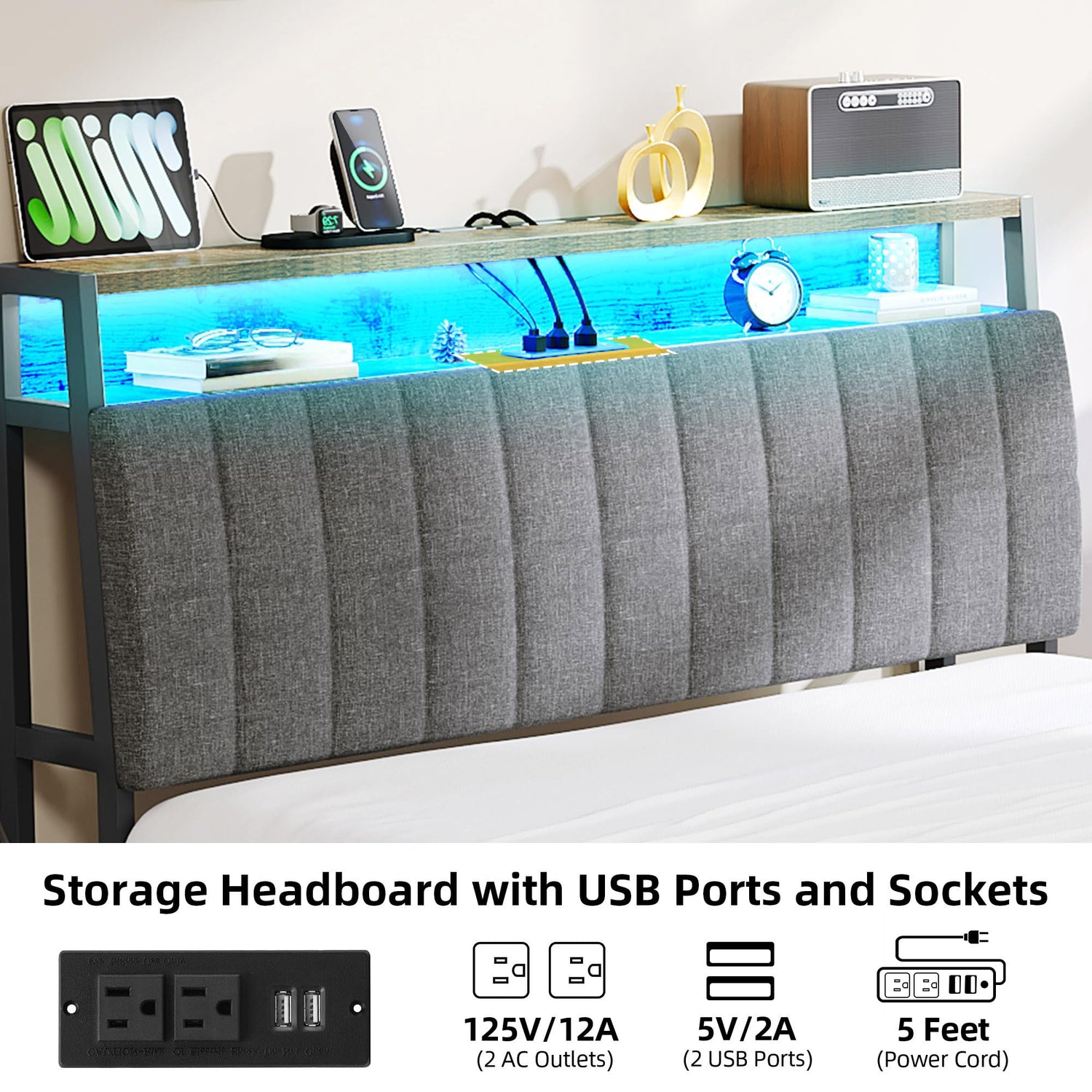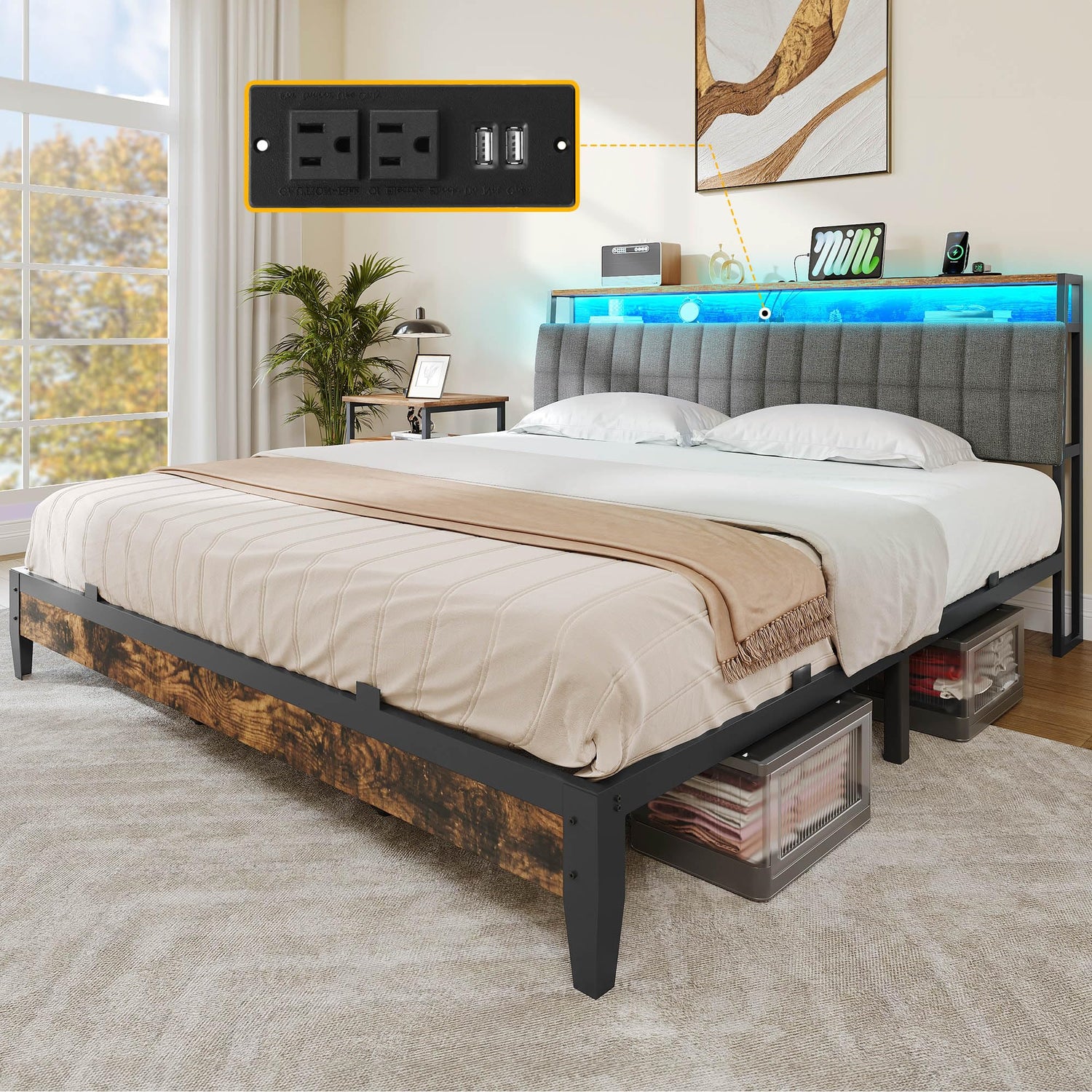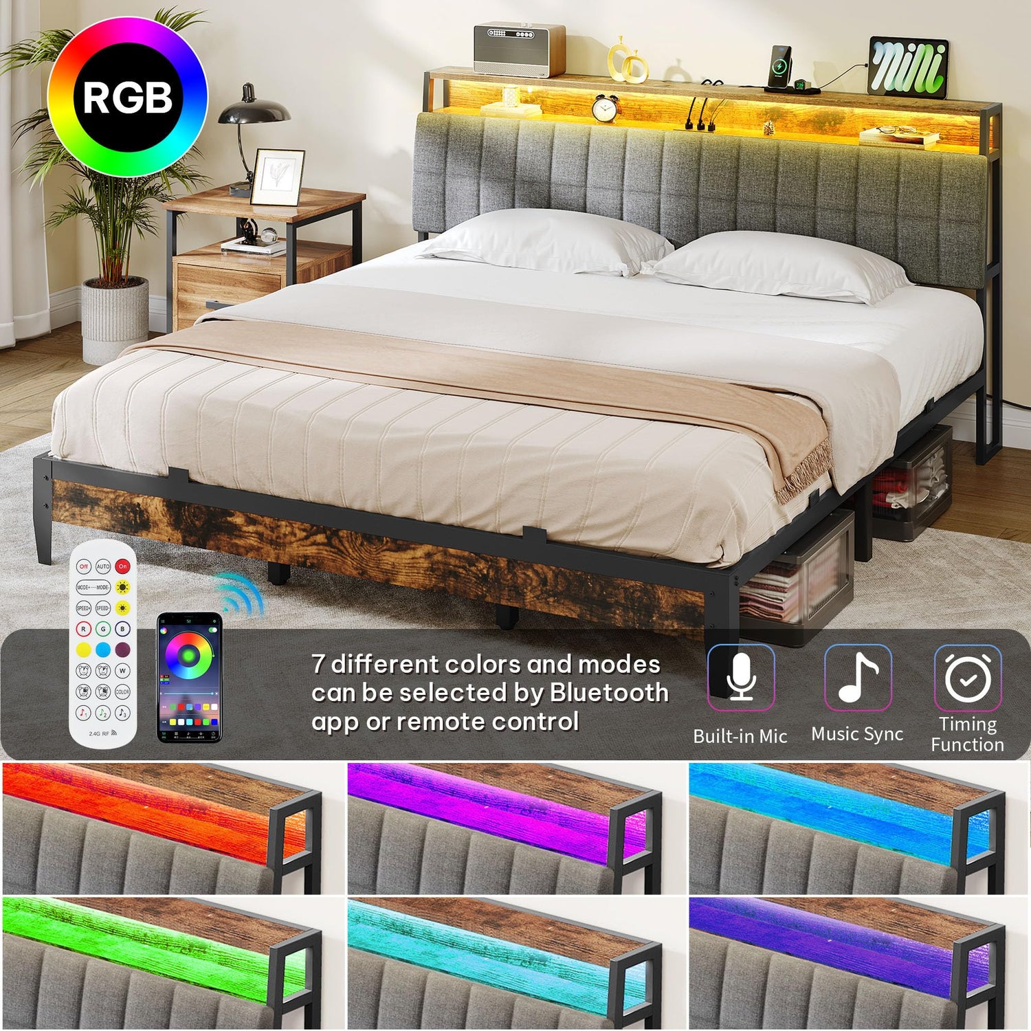 - 2-Tier Shelf & Upholstered Headboard - The king size bed frame with 2-tier storage headboard equals nightstands, makes mobile phones, glasses, books, coffee cups, chargers, etc. within easy reach. Made of skin-friendly and sweat-absorbent linen fabric, the RGB LED lights bed frame with headboard is more refreshing and breathable when you lean on it for a long time, and don't have to worry about bumping.
