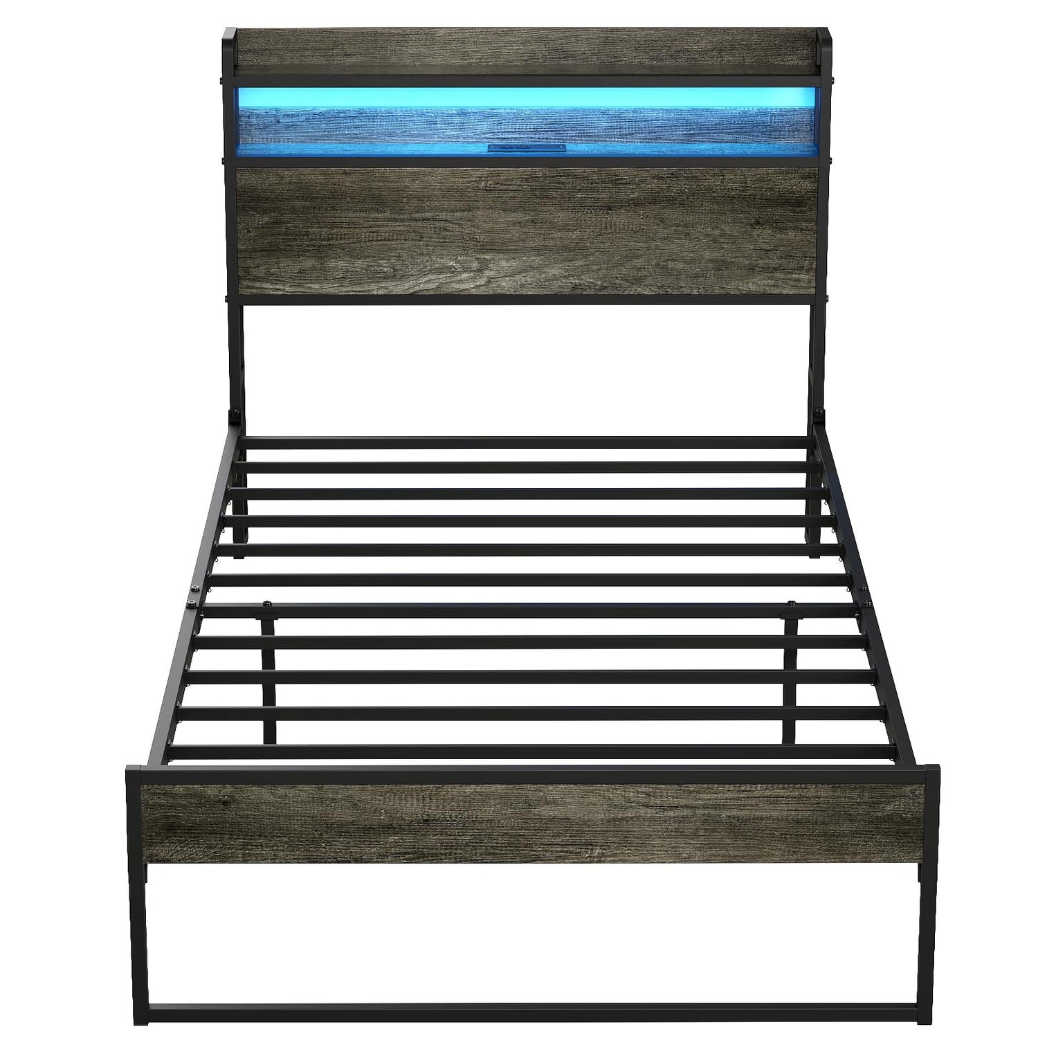 Elephance Twin Bed Frames with Charging Station and LED Lights, Metal Bed Frame with 2-Tier Storage Headboard, No Box Spring Needed, Noise Free, Easy Assembly