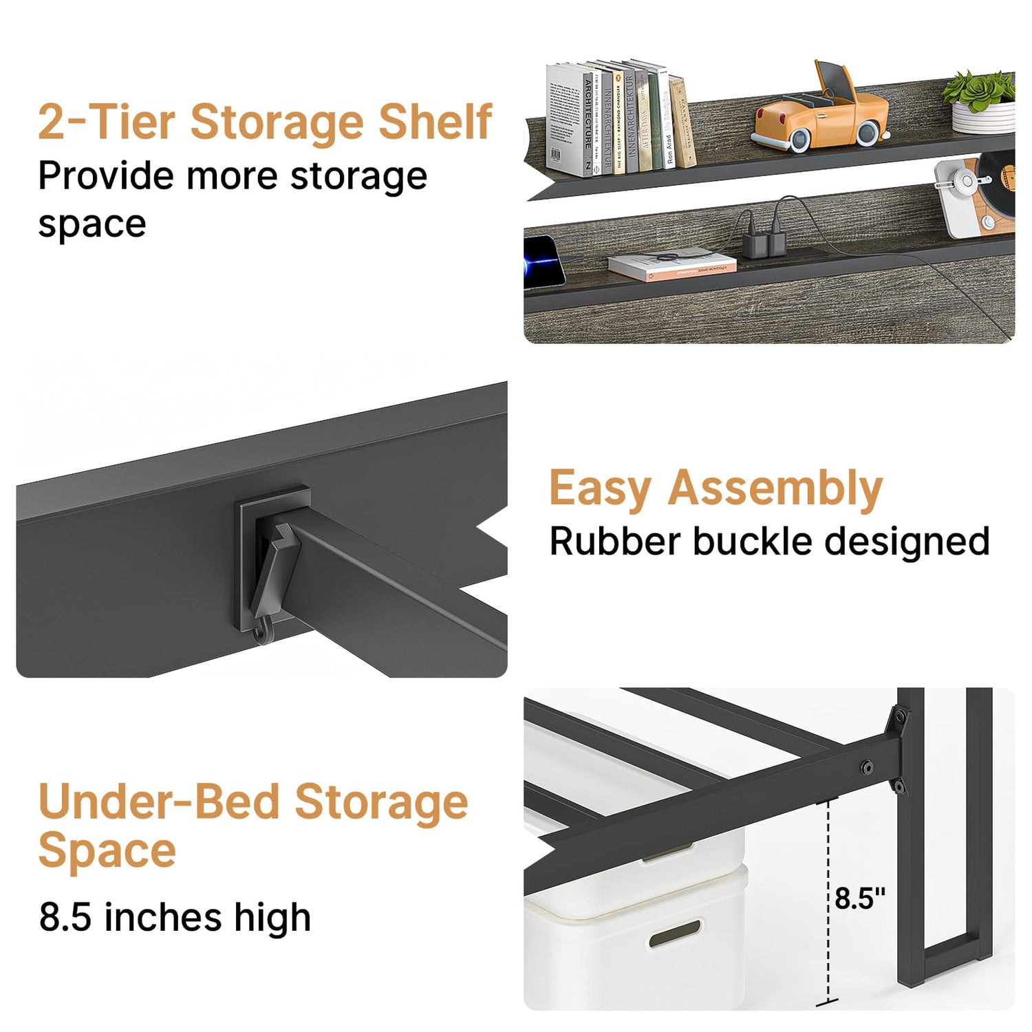 - 2-Tier Storage Shelf: The twin size bed frame with 2 tier storage shelves provide more storage space that it convenient for you to place commonly used items such as books, tissue box, lamps, etc.