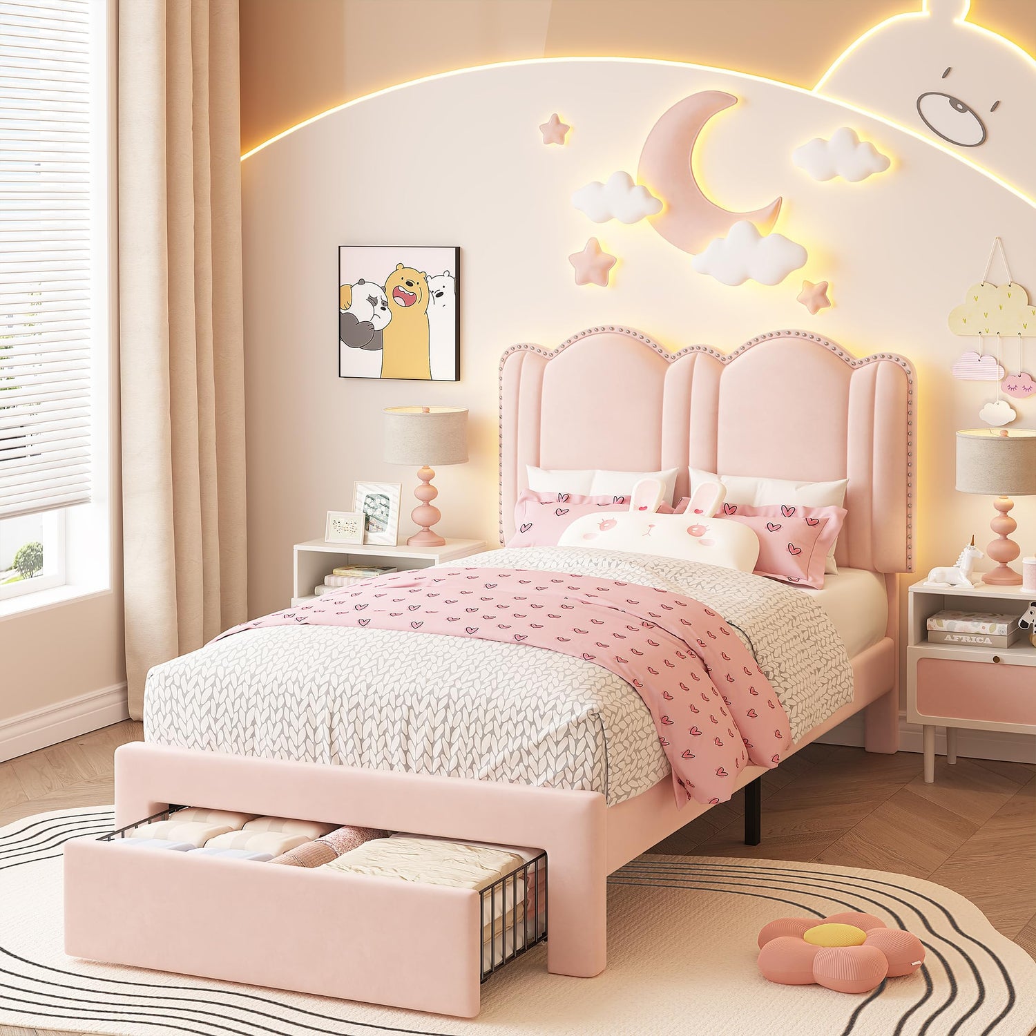 EnHomee Twin LED Bed Frame with Storage Drawer,Princess Bed Frame Twin Size,Cute Upholstered Bed Frame with Adjustable Cloud Headboard,Strong Support,No Box Spring Required,Easy Assembly,Pink