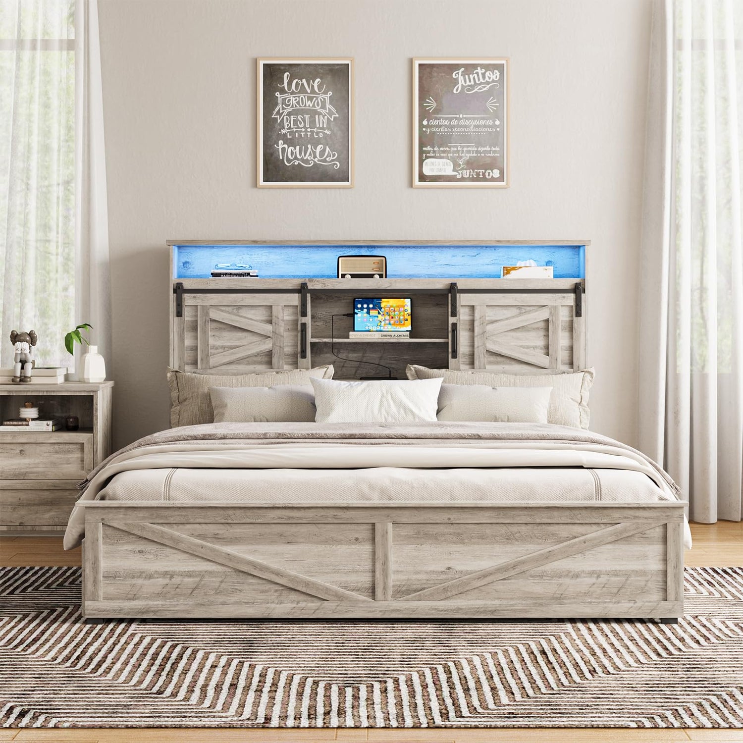 - 【Farmhouse Platform Bed Frame】Designed with barn doors on both the headboard and footboard, clean lines, and silhouettes, the decoration of the bedside vintage metal pegboard and acrylic doors adds a modernist touch. this queen bed frame combines modern and rustic styles, suitable for modern farmhouse decor.