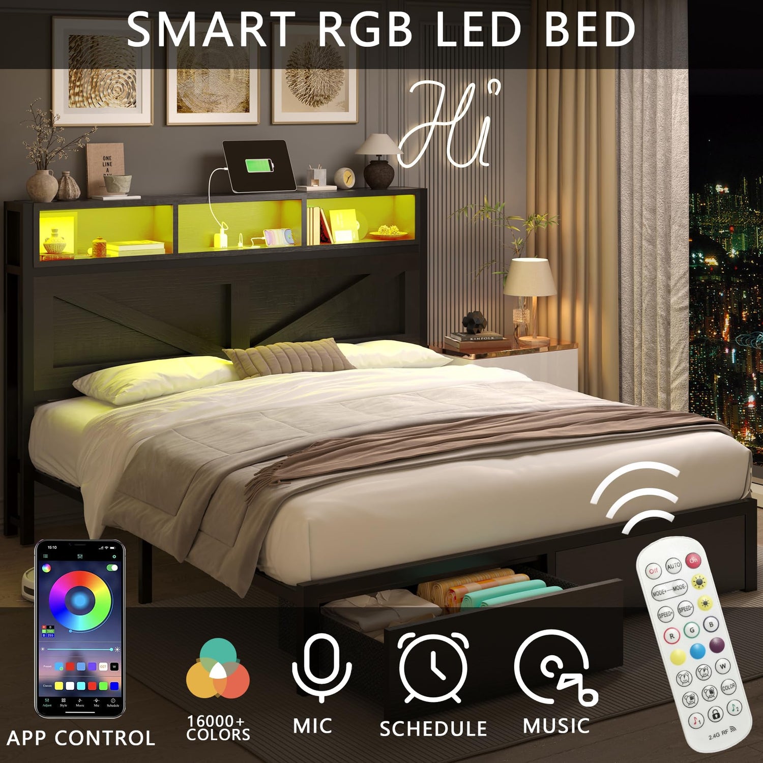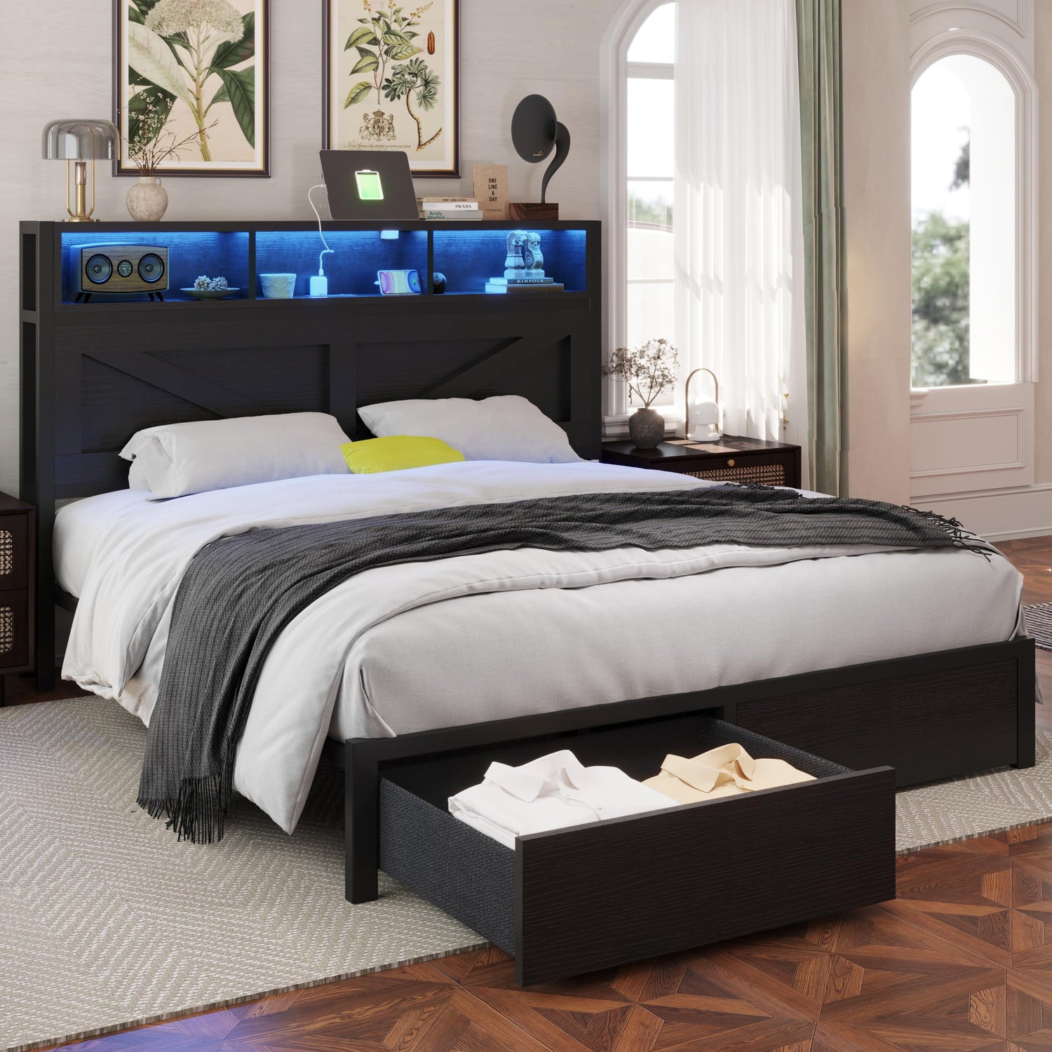 Farmhouse Queen Bed Frame with Bookcase Headboard and Storage Drawers, LED Lights and Charging Station, No Box Spring Needed, Noise Free, Black