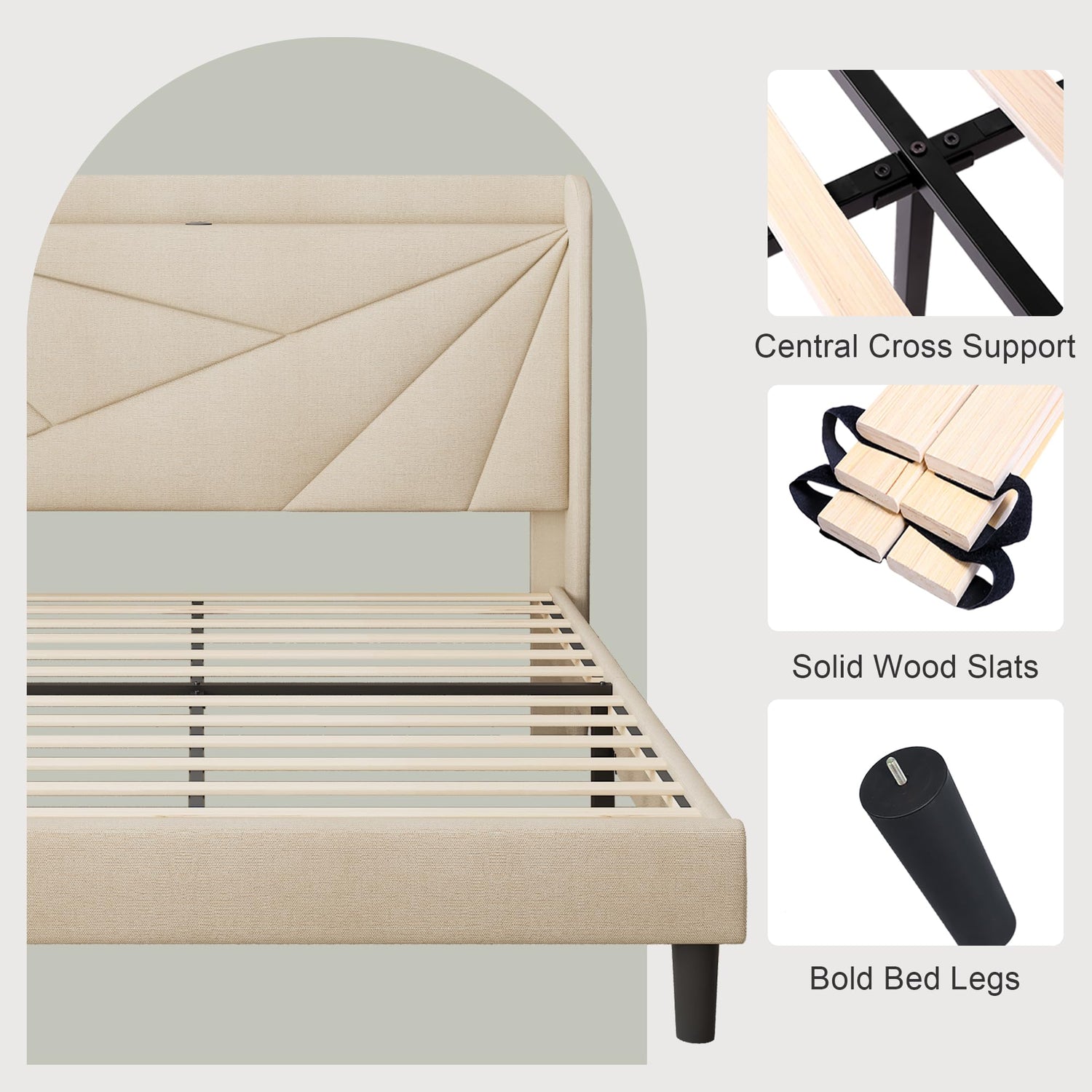 Feonase Queen Bed Frame with Charging Station, Upholstered Platform Bed Frame with Wingback Storage Headboard, Solid Wood Slats Support, No Box Spring Needed, Beige