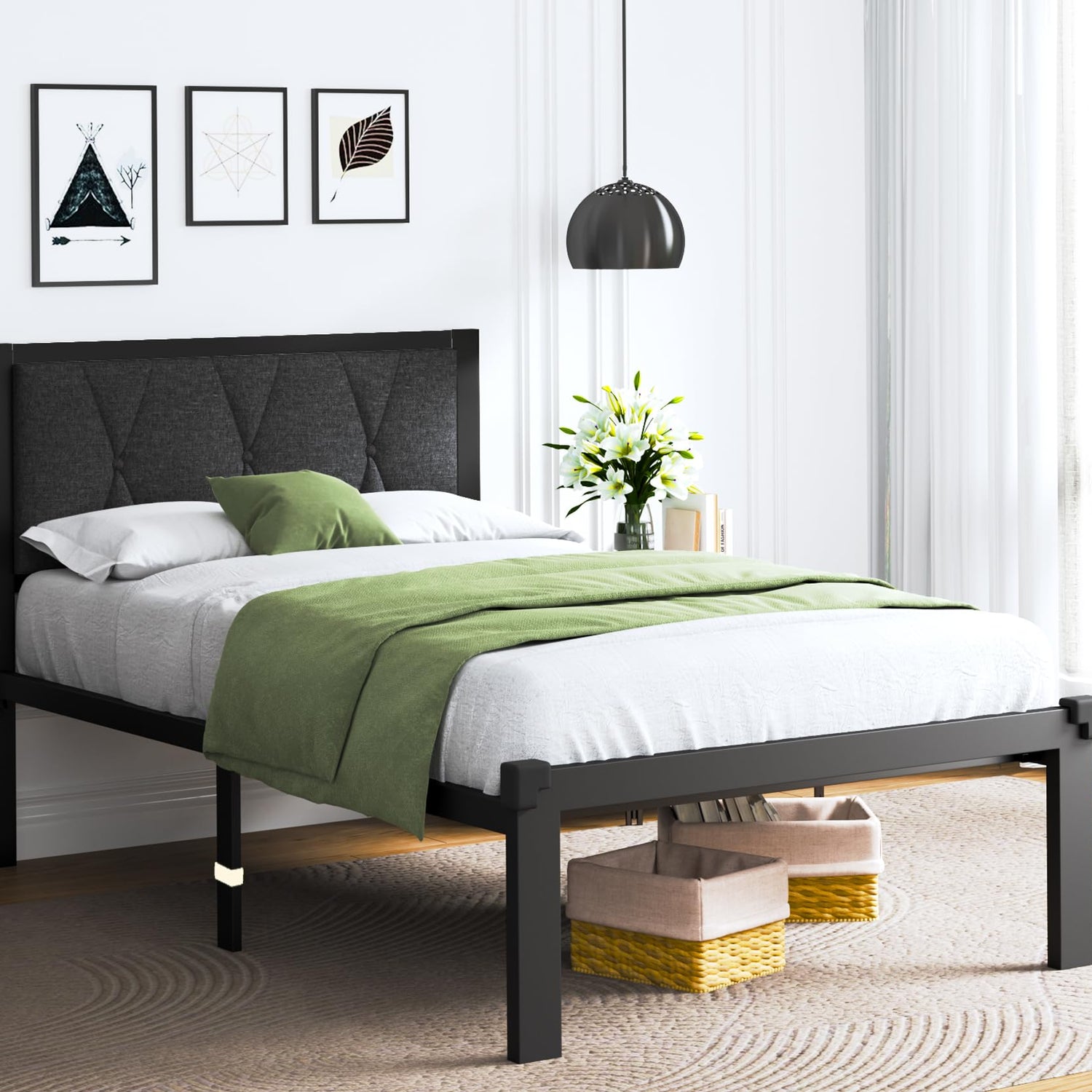 Feonase Twin Size Metal Bed Frame with Fabric Button Tufted Headboard, Platform Bed Frame with Heavy Duty Metal Slats, 12" Storage Space, Noise Free, No Box Spring Needed, Dark Grey