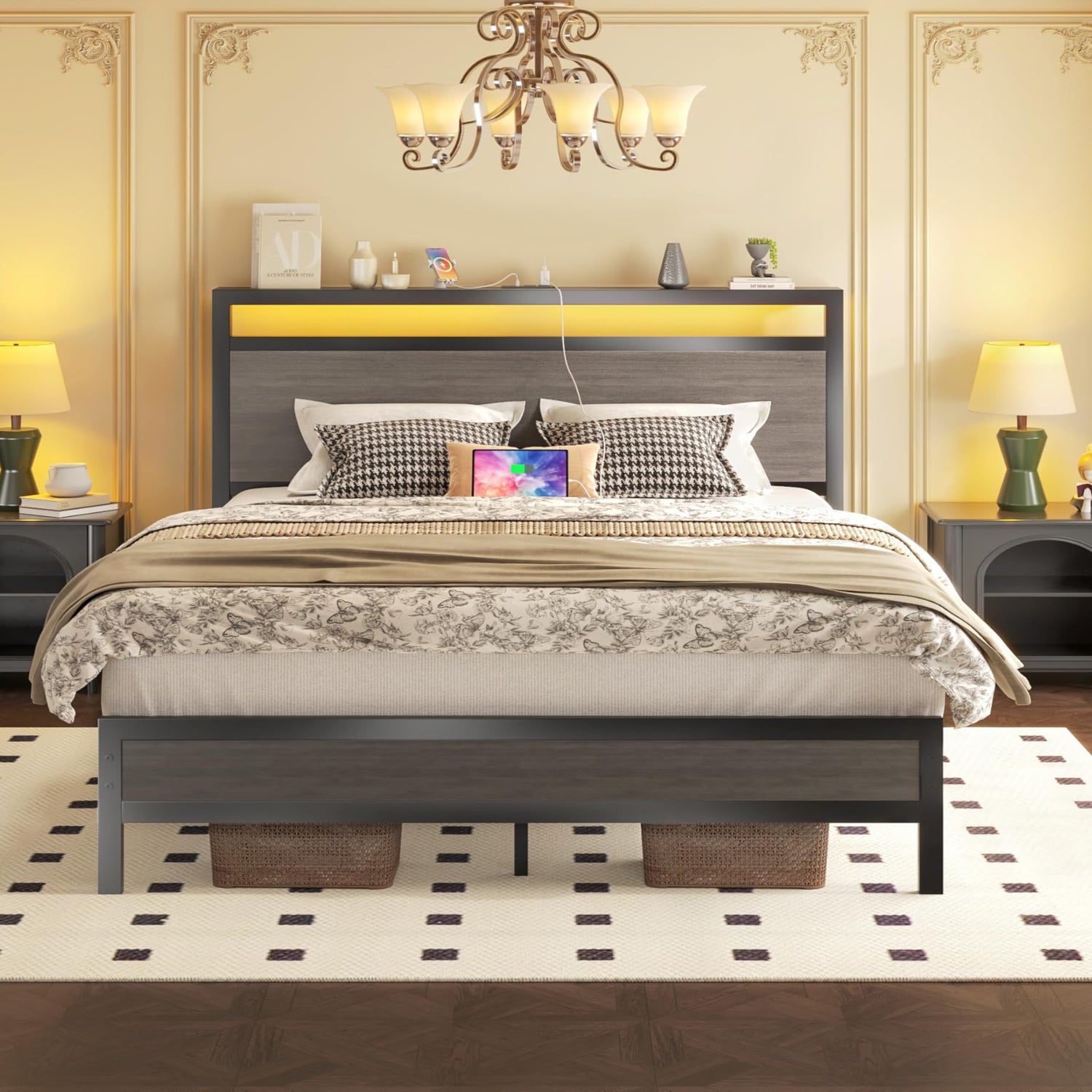 Fluest Queen Bed Frame with Headboard & Footboard, Bed Frame with Built-in Charging Station & LED Light, Storage Shelf, Noise-Free, No Box Spring Needed, Easy Assembly, Rustic Grey