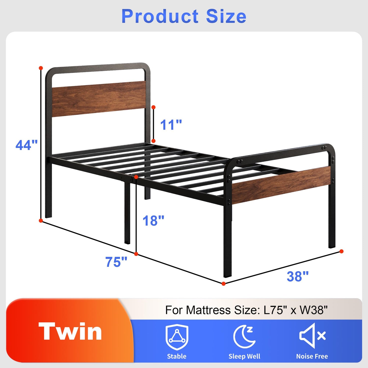 - No Box Spring Needed - The twin size bed frame can accommodate any type of mattress and can replace the box spring. The twin size bed frame with wood headboard is suitable for mattress sizes: 75"L x 38"W.