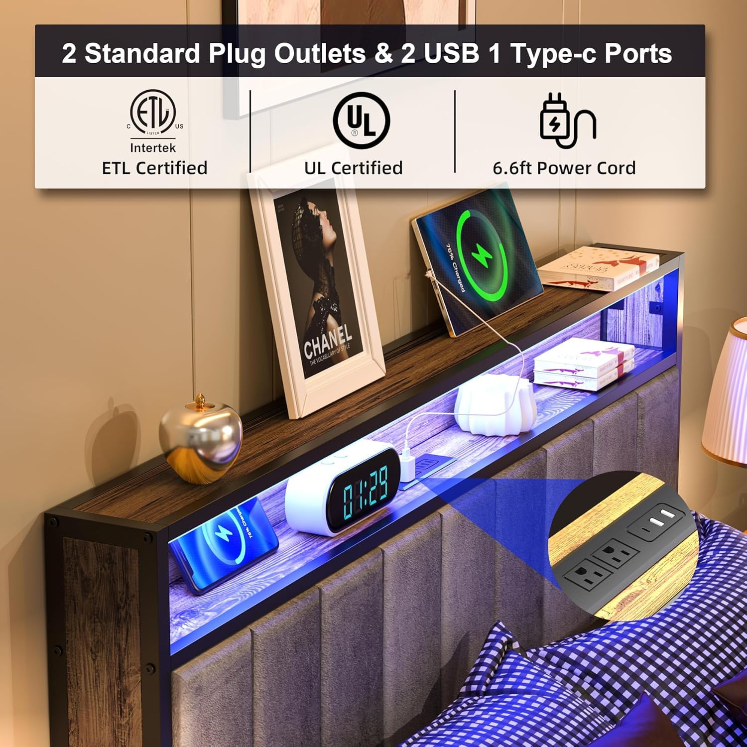 - Efficient & Convenient Storage: The headboard includes 2 standard outlets, 2 USB ports, and 1 Type-C port with a 6.6ft power cord, keeping devices charged and essentials like phones and glasses within easy reach.