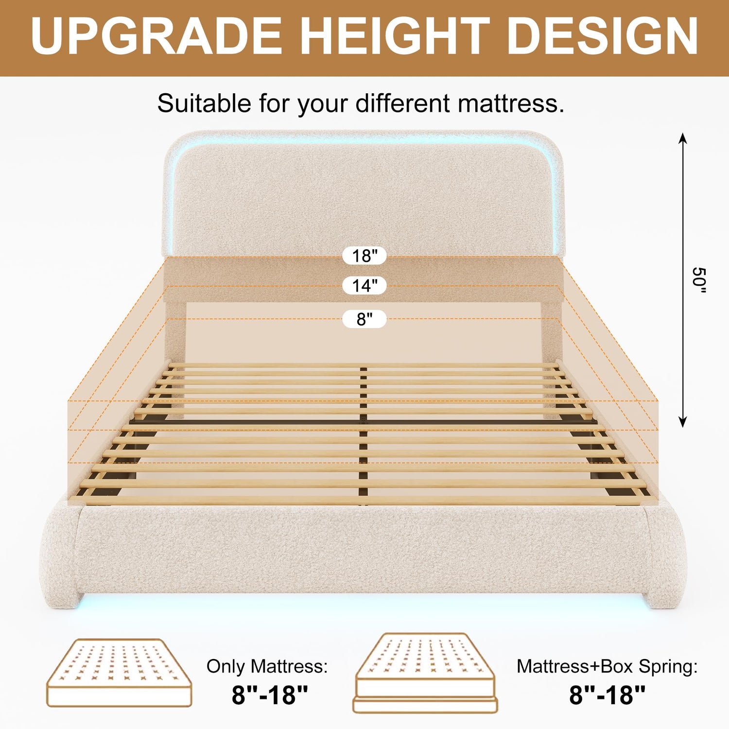 - Comfort and Durability: Soft boucle fabric modern bed frames with rounded corners add warmth and comfort to your bedroom. Full bed frame with 50" headboard that accommodates mattresses from 8" to 18", this cloud bed offers both style and practicality. Built with sturdy wood slats and steel supports, it can support up to 1000 pounds for lasting durability.
