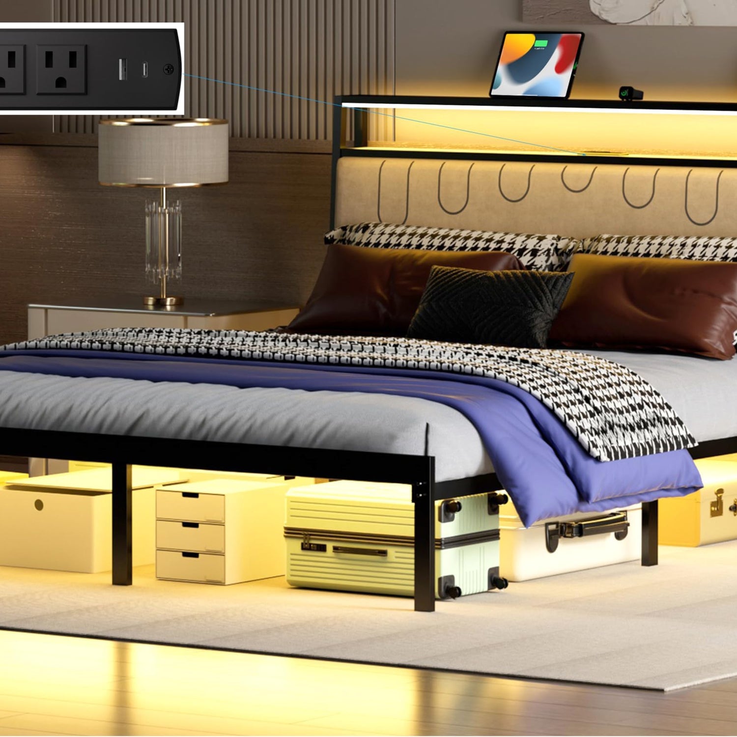Full size bed frame with led lights, Metal Platform Frame Upholstered Headboard, Charging Station, Storage Shelves, Heavy Duty Metal Slats, No Box Spring Needed, Noise Free, Easy Assembly, Black