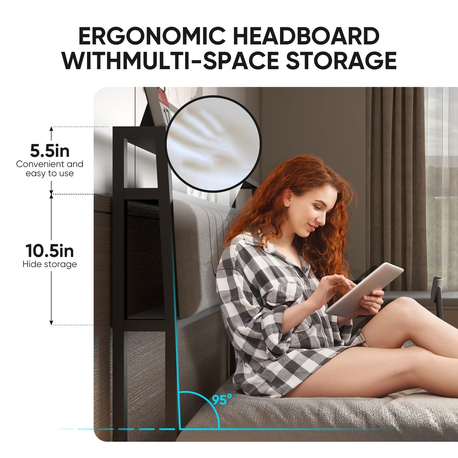 - 【Comfy and Chic bed frame】 The headboard of the is wrapped in high-quality plush fabric, filled with High rebound memory sponge. An ergonomic tilt, When you lean on the headboard, this soft headboard will provide good support for your back. makes the headboard comfortable to recline on while reading in bed.