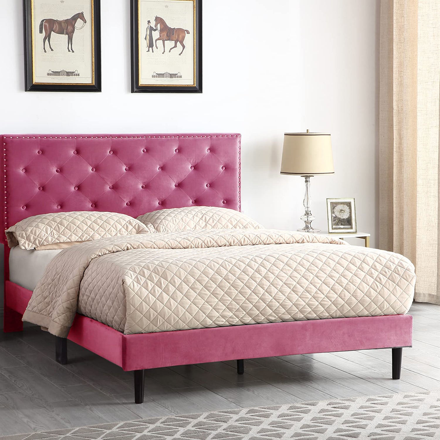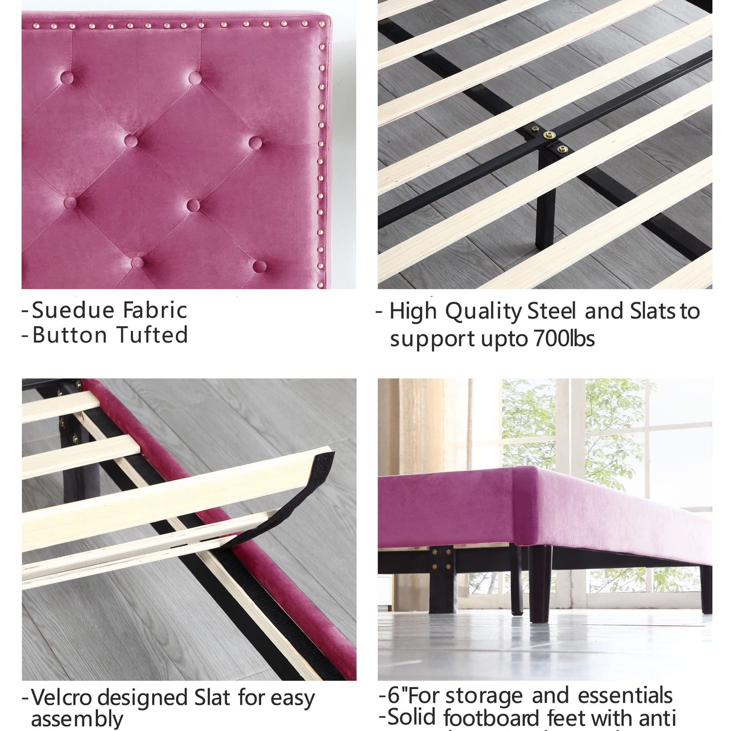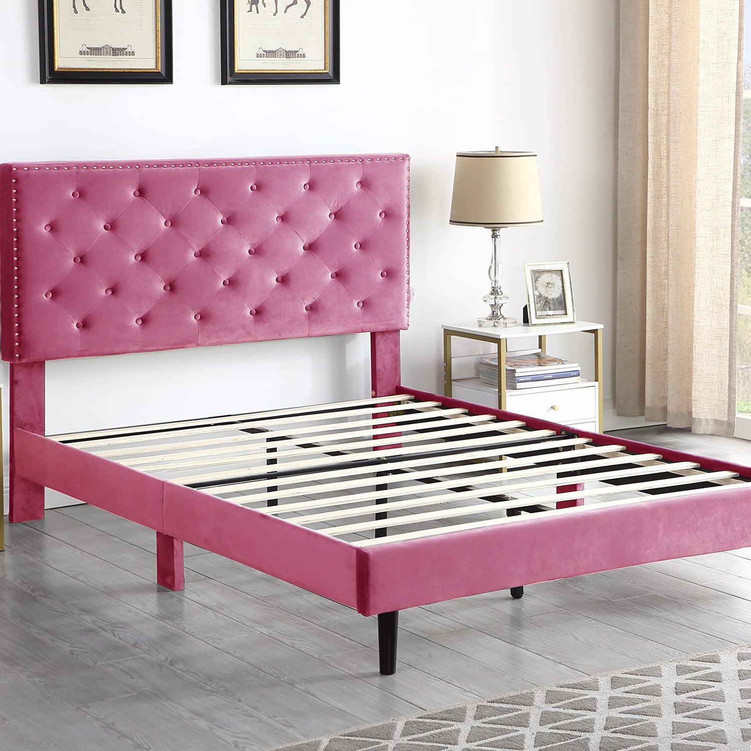 - The Vibrant Pink Color Bed frame is sensual and brightens your room, most likely to go with neutral-colored furniture in the room.