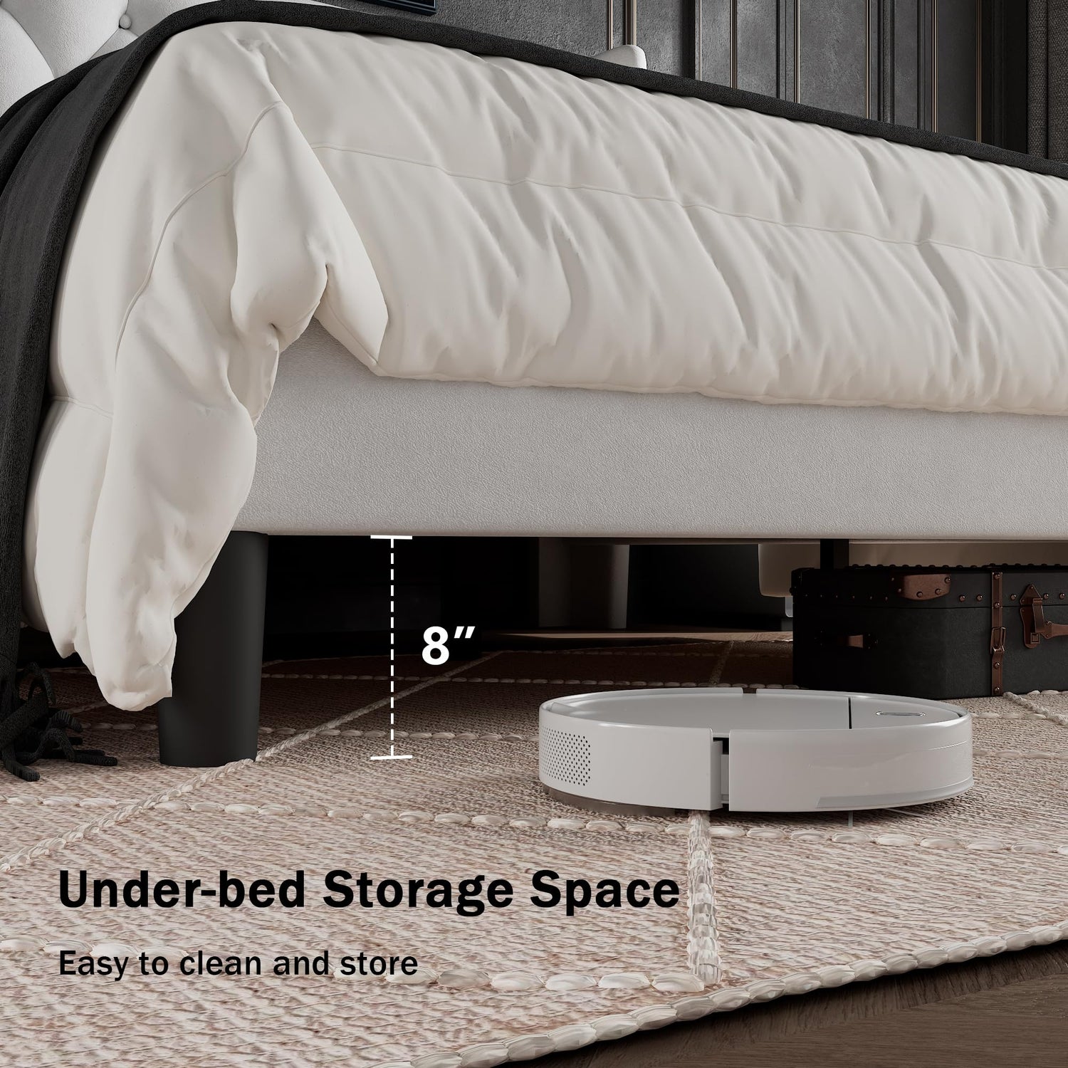 - 8" Under-Bed Storage Space: Unlock the ample storage area beneath our bed frame, which offers 8 inches of clearance—ideal for stowing away luggage and shoeboxes while maximizing your bedroom space