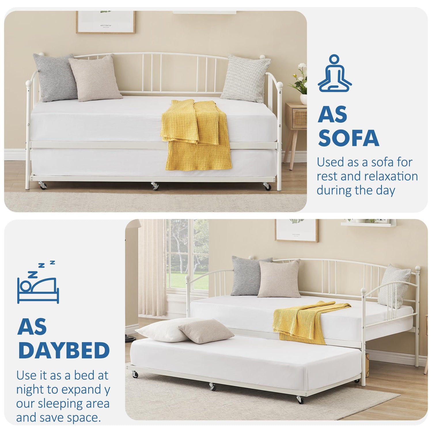 GarveeHome Daybed with Trundle, Sturdy Metal Day Bed with Steel Slat Support, Trundle Bed Twin with Arched Headboard, SofaBed for Living Room, Bedroom and Guest Room, White