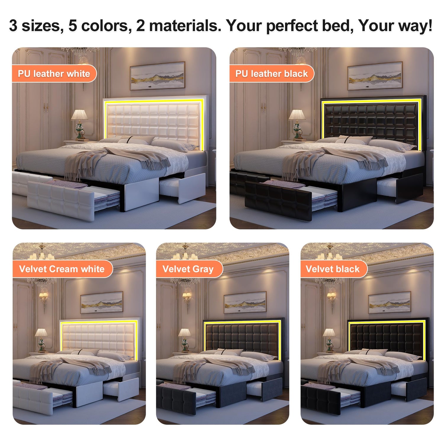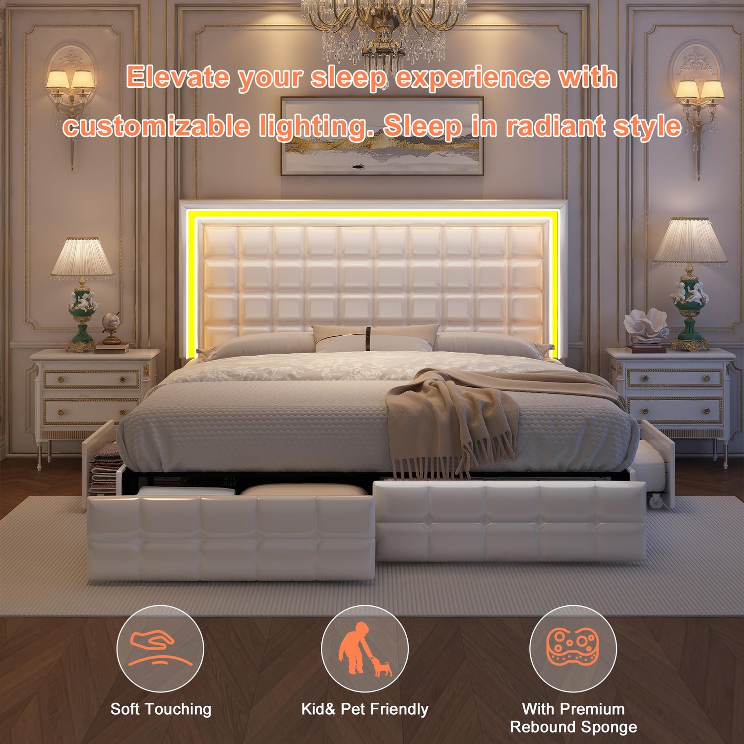 GEGOFORU LED Upholstered King Bed Frame with Adjustable Headboard and 4 Drawers in PU White