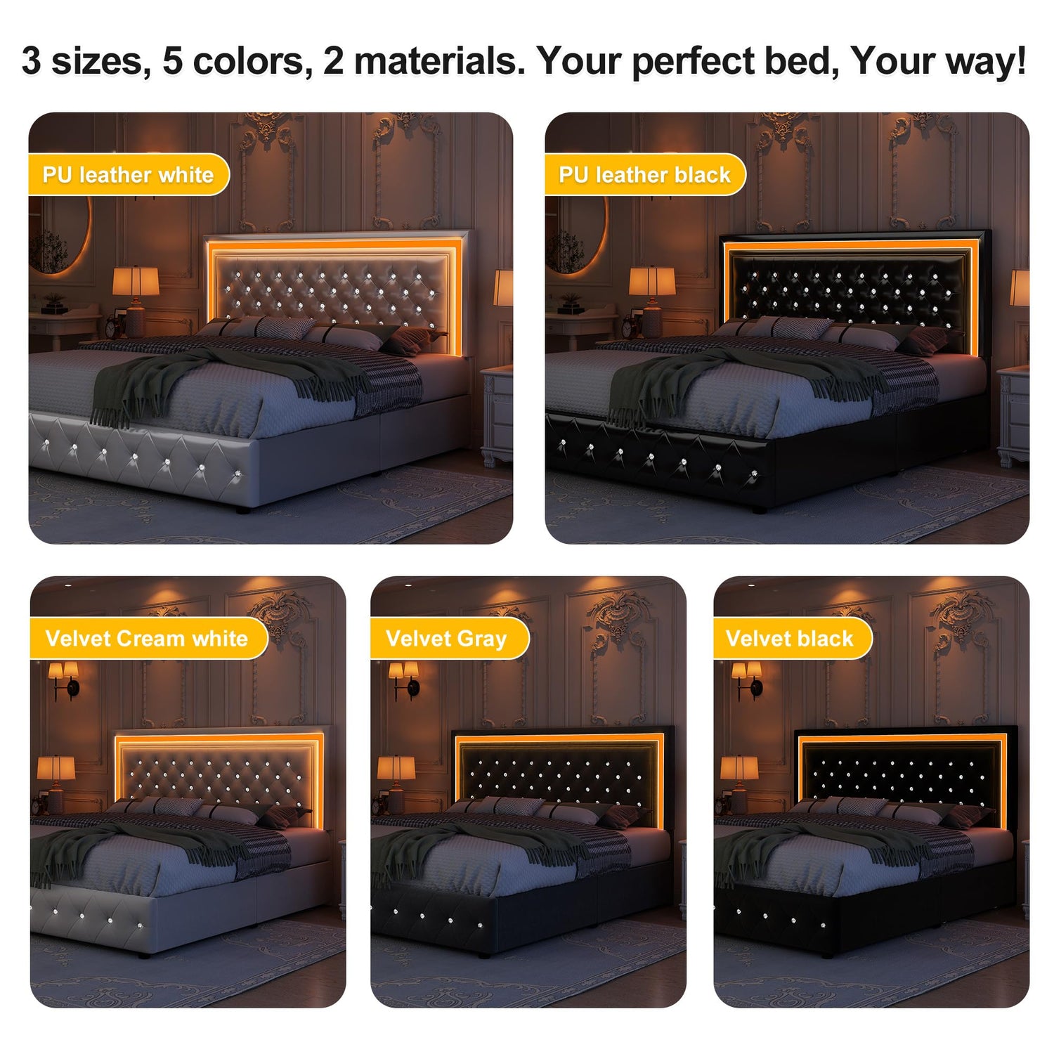 Choose from two luxurious fabric finishes to suit your personal style. Opt for the plush velvet for a soft, welcoming feel or the sleek PU leather that offers a sophisticated, easy-to-clean option. Either choice adds a beautiful touch of elegance to your bedroom decor.